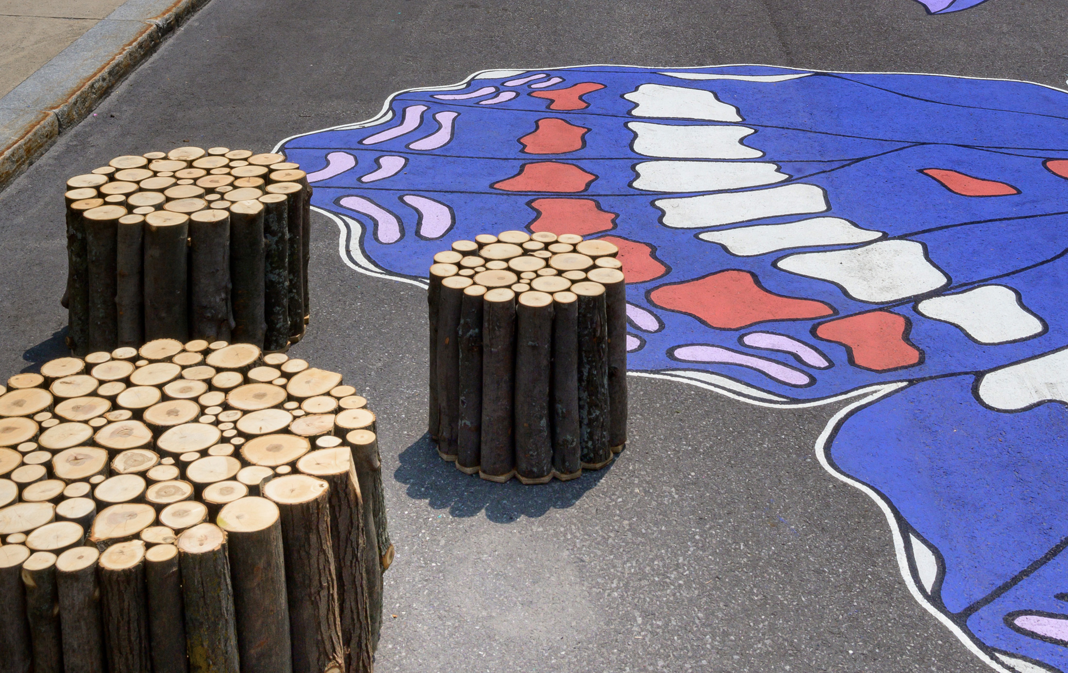 Les assises installées sur ce portrait grandiose de la flore locale ont été créées à partir d’arbres qui ont cédé sous le poids de la glace lors de la forte tempête de verglas qui a frappé le Québec en avril 2023. Il s’agit principalement de branches qui sont tombées sur le mont Royal, lieu emblématique du paysage montréalais. Le bois brut non écorcé ajoute une touche de texture et d’authenticité à l’ensemble. Ces troncs fraîchement coupés continueront d’évoluer et de se transformer au cours de l’été. Ils sont des témoins de notre nordicité et un rappel de l’équilibre fragile qui régit la nature et ses éléments.