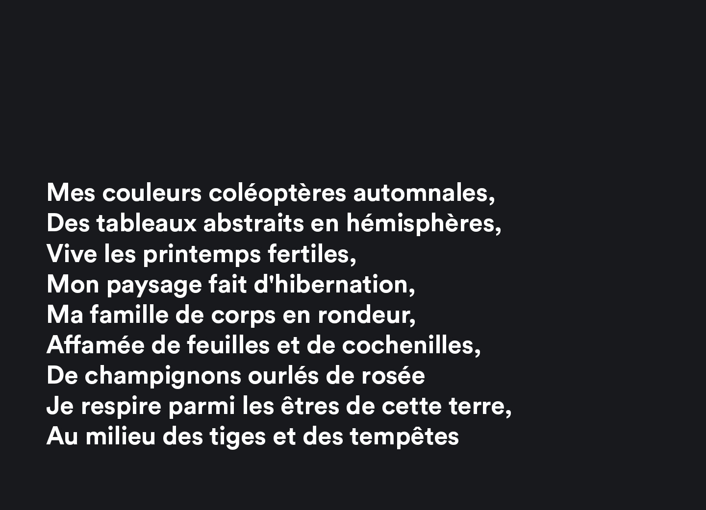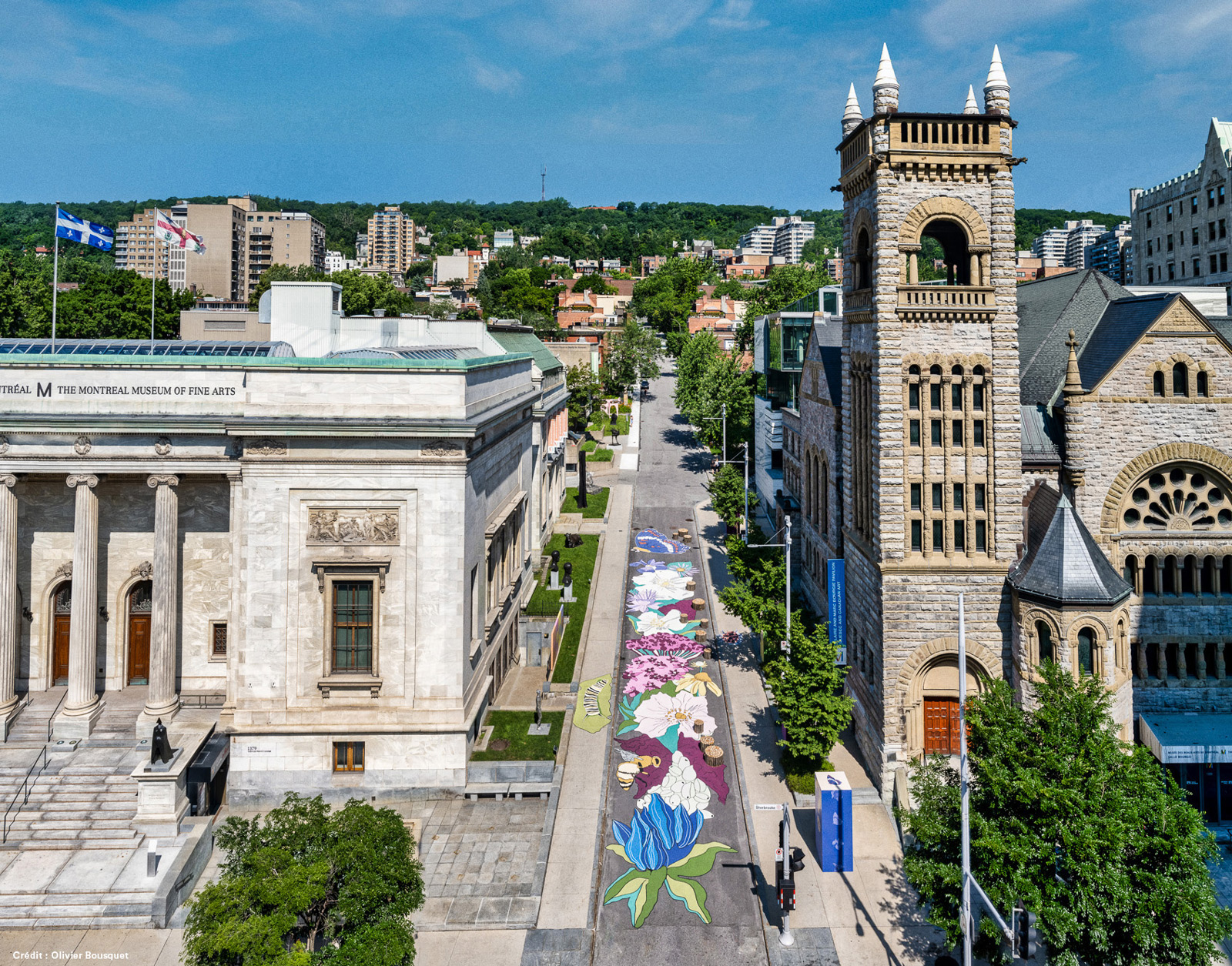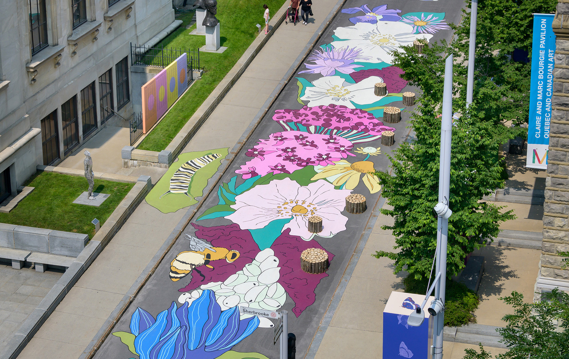 Depuis 2013, l’avenue du Musée se transforme chaque été en aire piétonne et le MBAM invite des créatrices et des créateurs d’ici à y présenter une installation. Cette année, vous y découvrirez une œuvre du Collectif Escargo, réalisée en collaboration avec MU, qui rend hommage à la biodiversité de la région ainsi qu’aux plantes et aux insectes qui contribuent tous les jours à son épanouissement.
