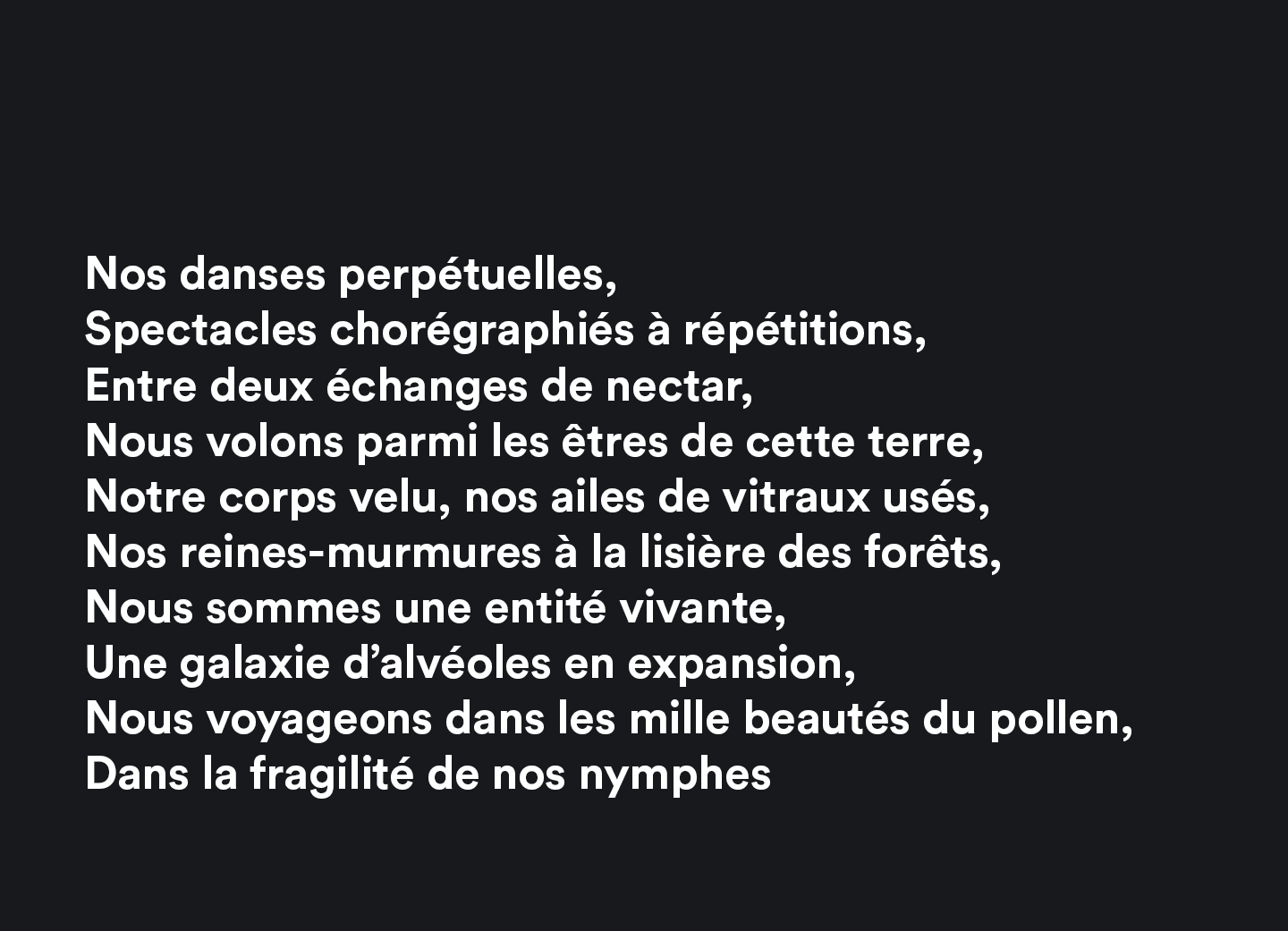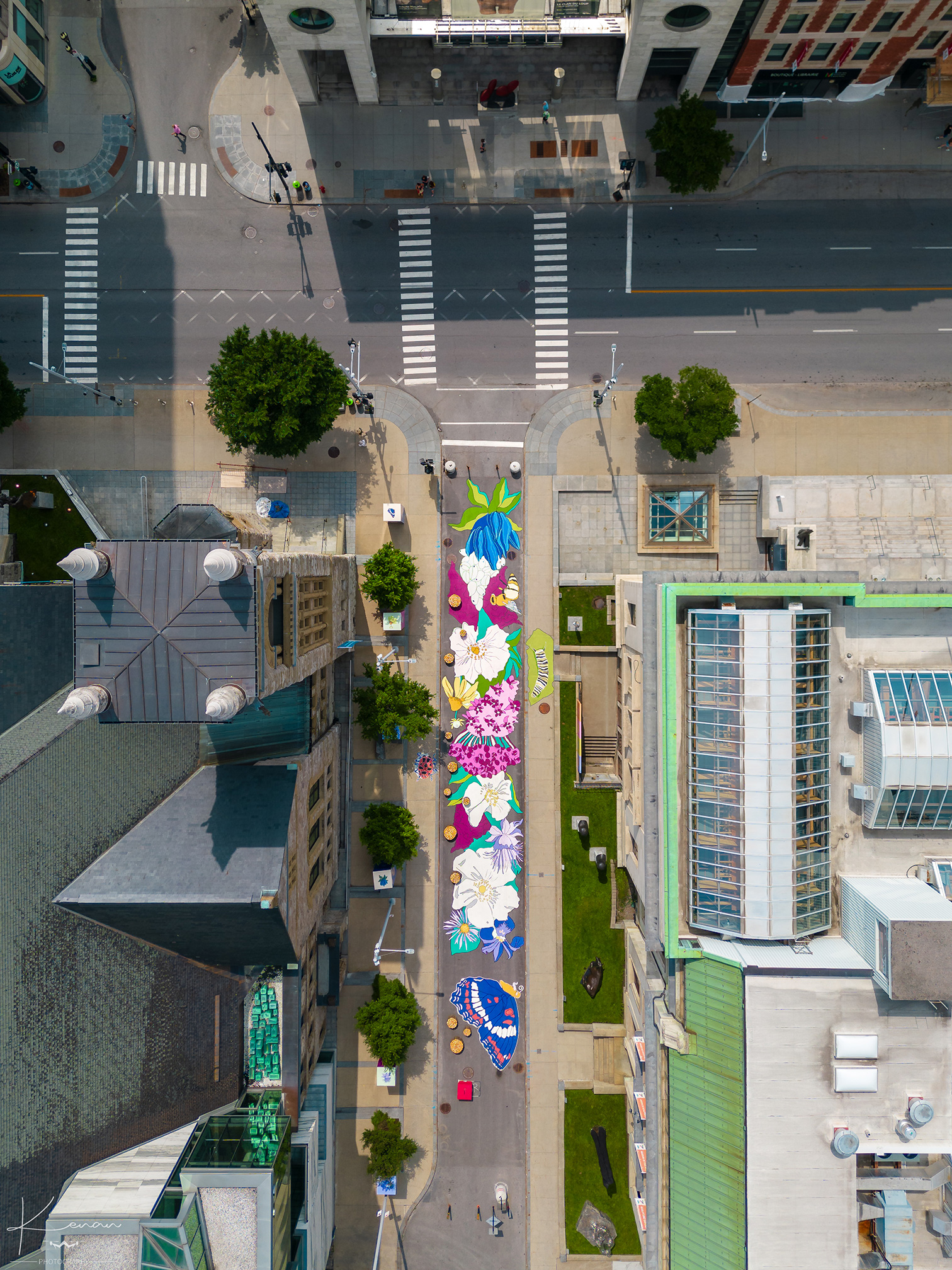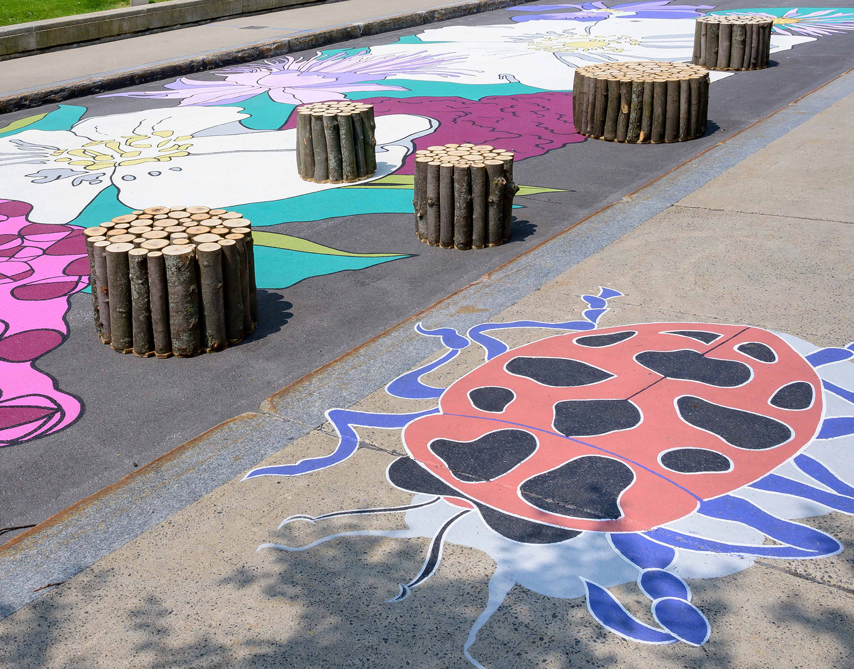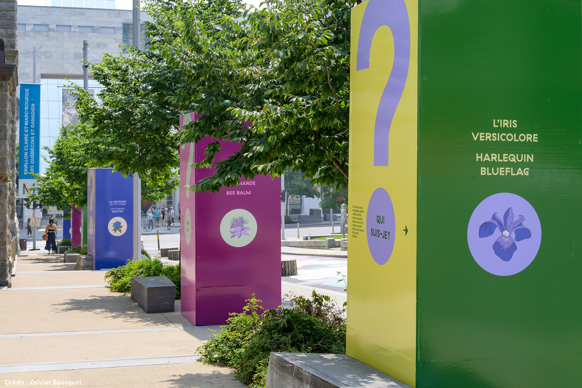 Un bouquet peint présentant une dizaine de végétaux s’étend sur l’avenue comme autant de portraits à découvrir. À travers eux, quatre alliés, quatre insectes pollinisateurs, petits bâtisseurs de l’ombre qui travaillent fort pour nos écosystèmes. Au-delà de leur aspect ludique et attrayant, ces végétaux et insectes surdimensionnés suscitent aussi une réflexion sur la place de la nature dans nos espaces urbains. C’est une invitation au mouvement, à aller à la recherche de ces plantes qui poussent à l’état sauvage et à s’attarder à toute cette vie qui palpite dans les interstices de la ville. Munissez-vous de votre téléphone intelligent et repérez les codes QR apposés sur certains éléments de l’installation pour accéder à des contenus qui vous permettront d’en apprendre plus sur les fleurs et les insectes représentés.