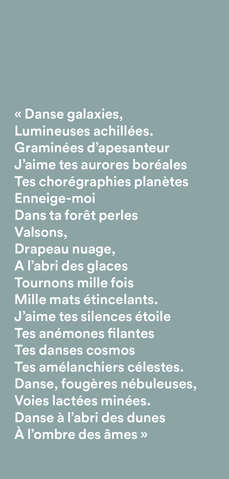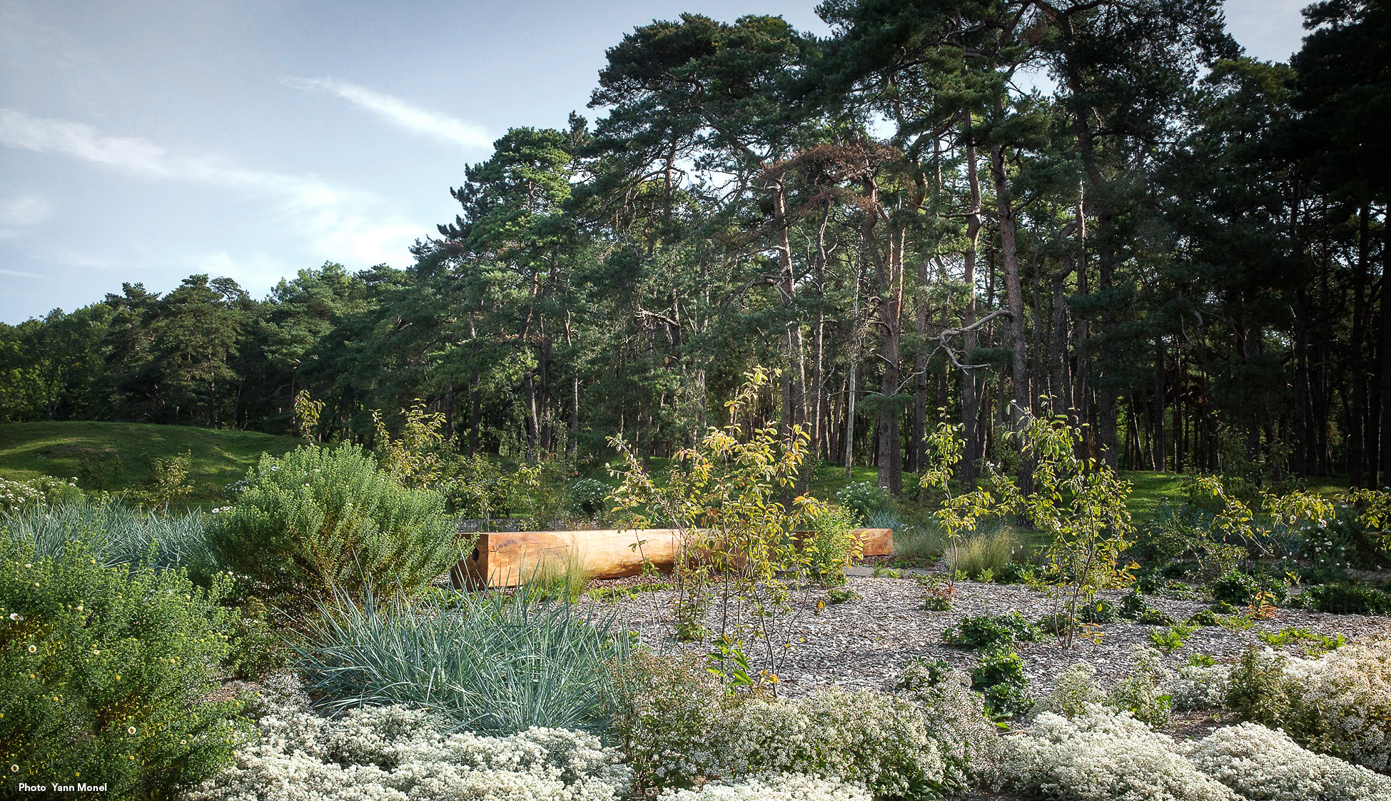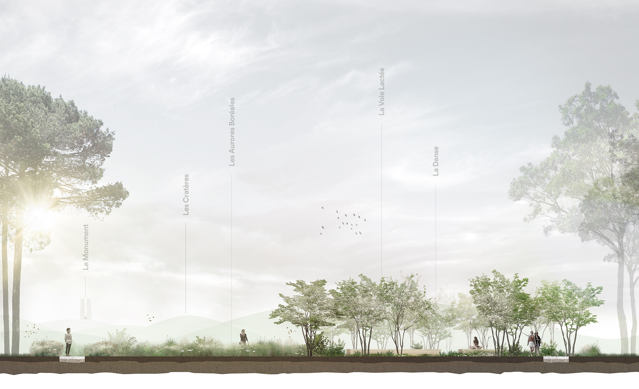 Les floraisons blanches des plantes, les troncs gris pâles des amélanchiers, ainsi que la structure géométrique de la Voie Lactée rappellent le drapeau blanc, symbole universel de la paix. L’enveloppe blanche du décor est une métaphore des paysages enneigés. Elle renvoie à l’image d’un ciel et d’une terre unis dans un même blanc paisible et lumineux. La verticalité des amélanchiers et leur présence singulière dialoguent avec l’architecture présente sur le site. Les floraisons successives sont des milliers de drapeaux blancs qui dansent au gré du vent et des saisons. Ces drapeaux universels symbolisent un dialogue céleste sans frontière, rassembleur, vivant et harmonieux.