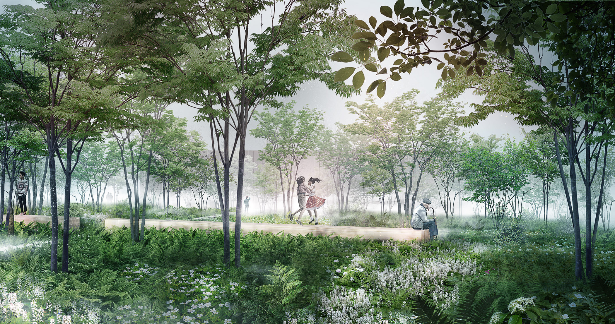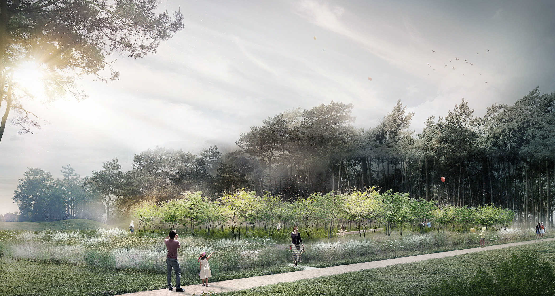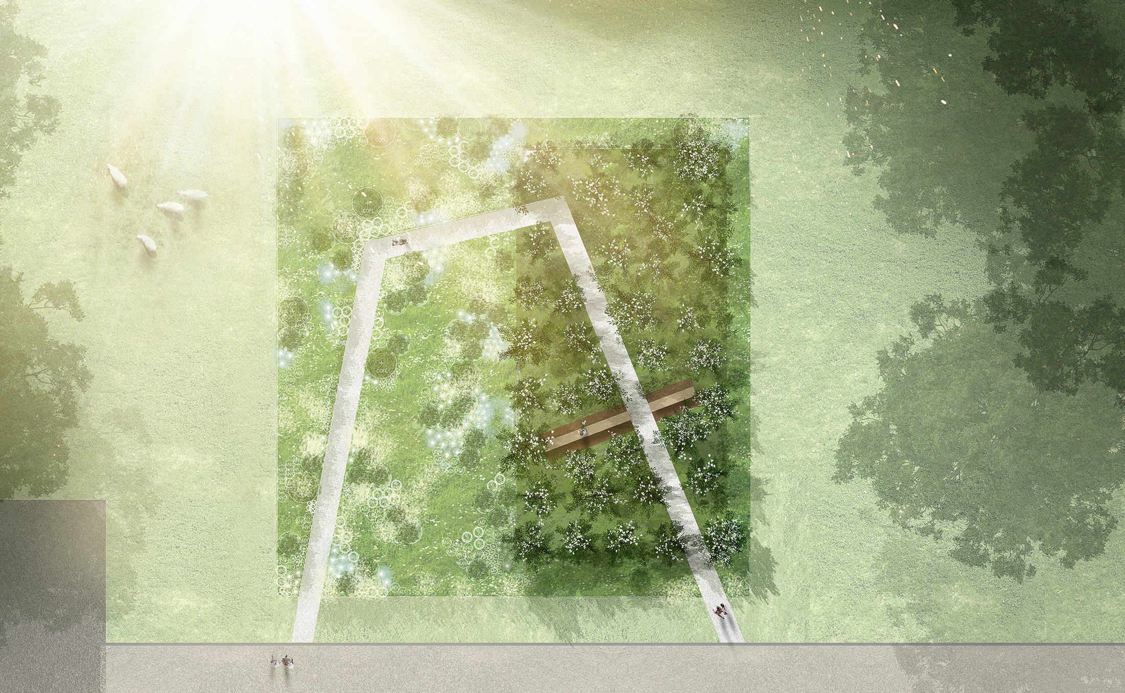 Les floraisons blanches des plantes, les troncs gris pâles des amélanchiers, ainsi que la structure géométrique de la Voie Lactée rappellent le drapeau blanc, symbole universel de la paix. L’enveloppe blanche du décor est une métaphore des paysages enneigés. Elle renvoie à l’image d’un ciel et d’une terre unis dans un même blanc paisible et lumineux. La verticalité des amélanchiers et leur présence singulière dialoguent avec l’architecture présente sur le site. Les floraisons successives sont des milliers de drapeaux blancs qui dansent au gré du vent et des saisons. Ces drapeaux universels symbolisent un dialogue céleste sans frontière, rassembleur, vivant et harmonieux.