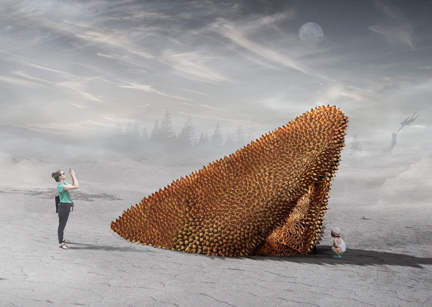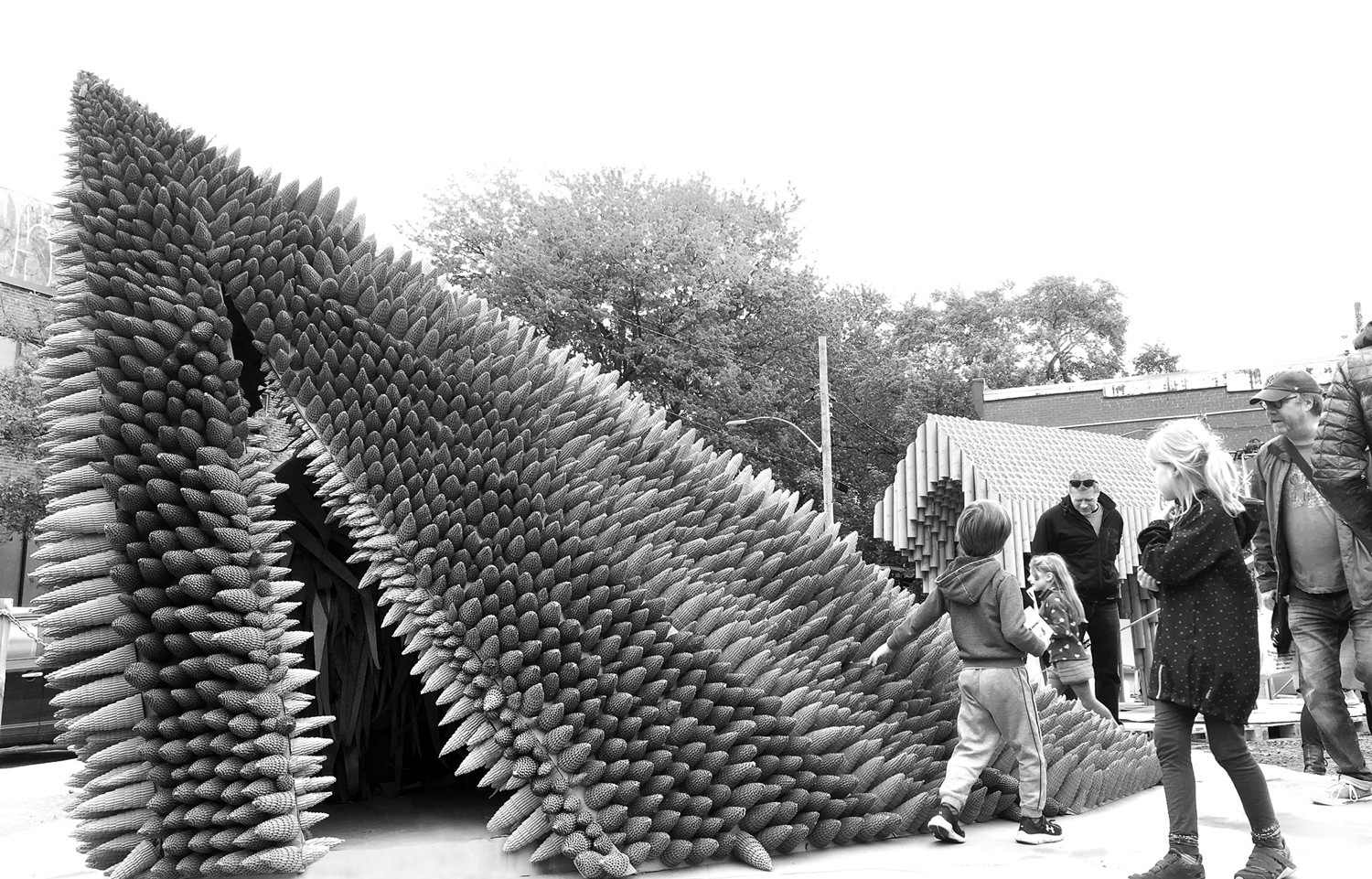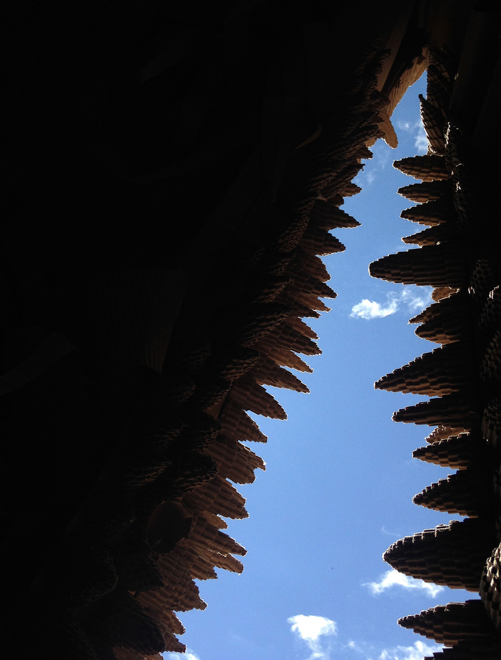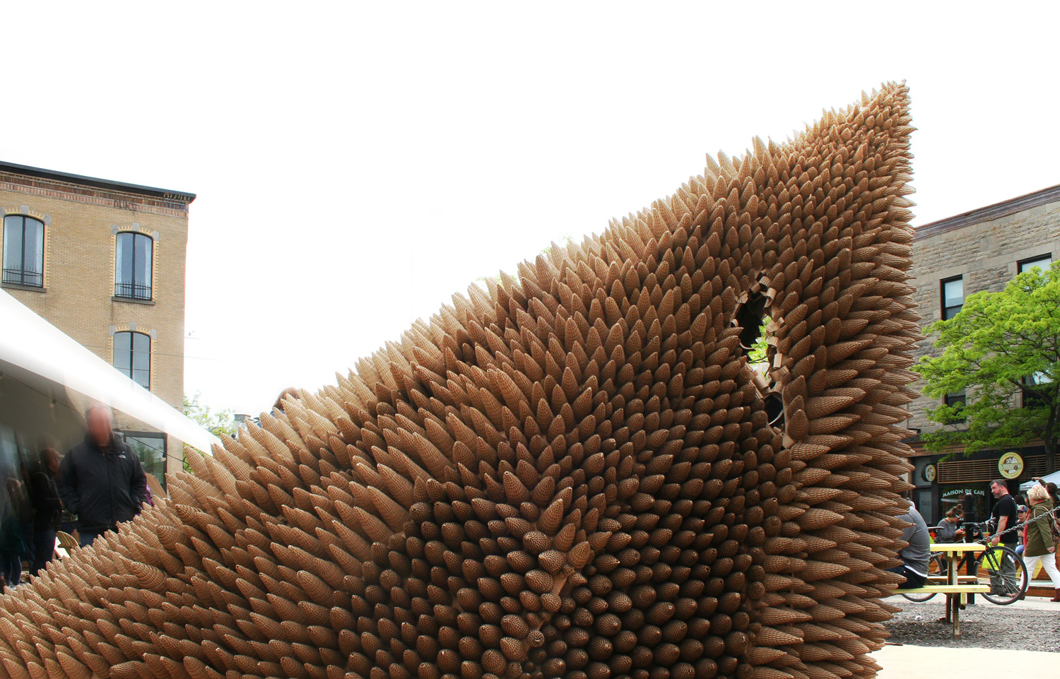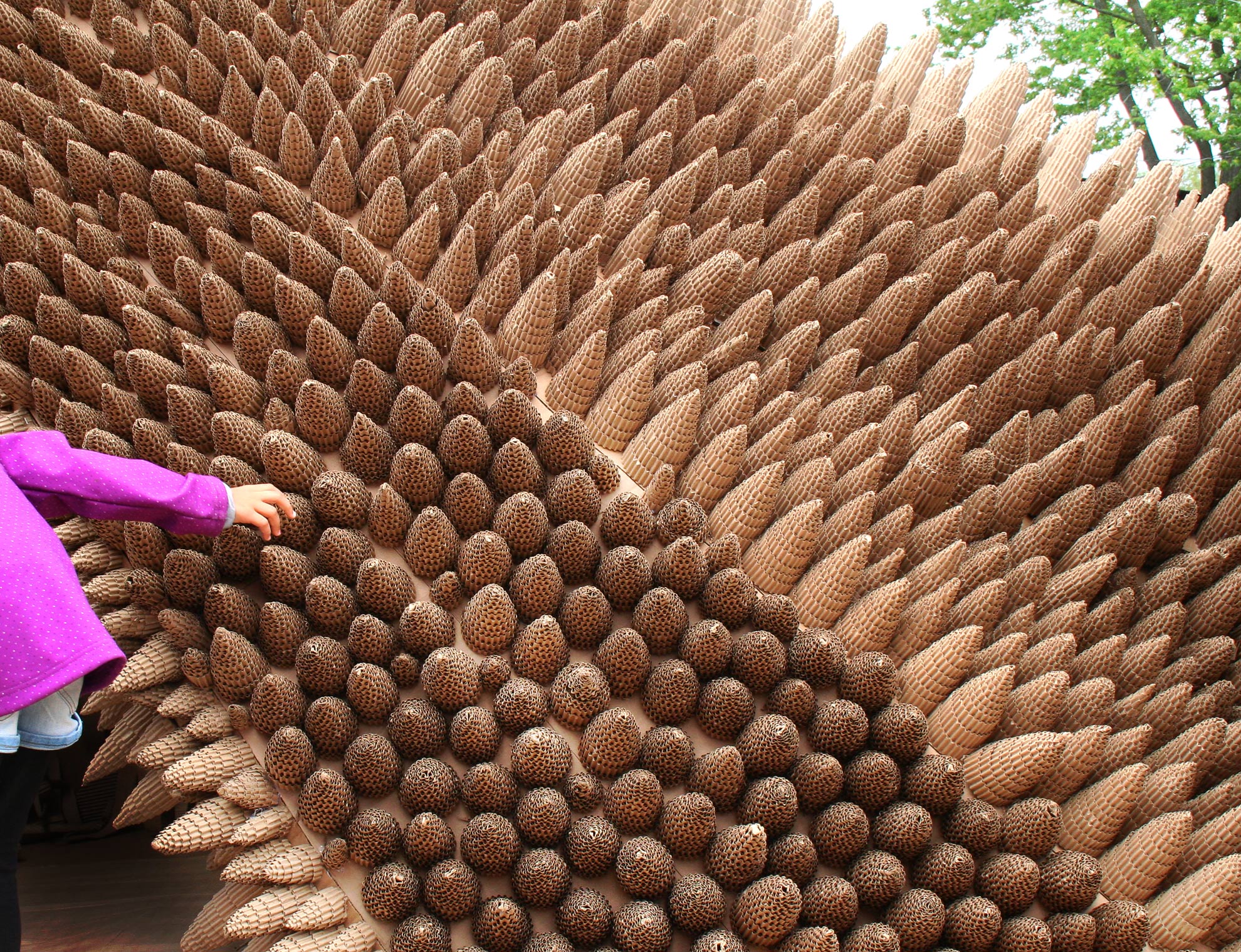 L’éclosion est une cabane comme une forteresse du repos. Un lieu figé hors temps, un moment d’arrêt, une immobilité. La coque de la cabane est une membrane qui assure la tranquillité du dormeur. Recouverte de pièges et d’épines, elle rebute quiconque voudrait perturber le précieux sommeil de ceux qui l’habitent. À l’inverse, son intérieur est duveteux, obscur et paisible. Il invite à la sieste idéale, celle dont on s’éveil léger et vif.