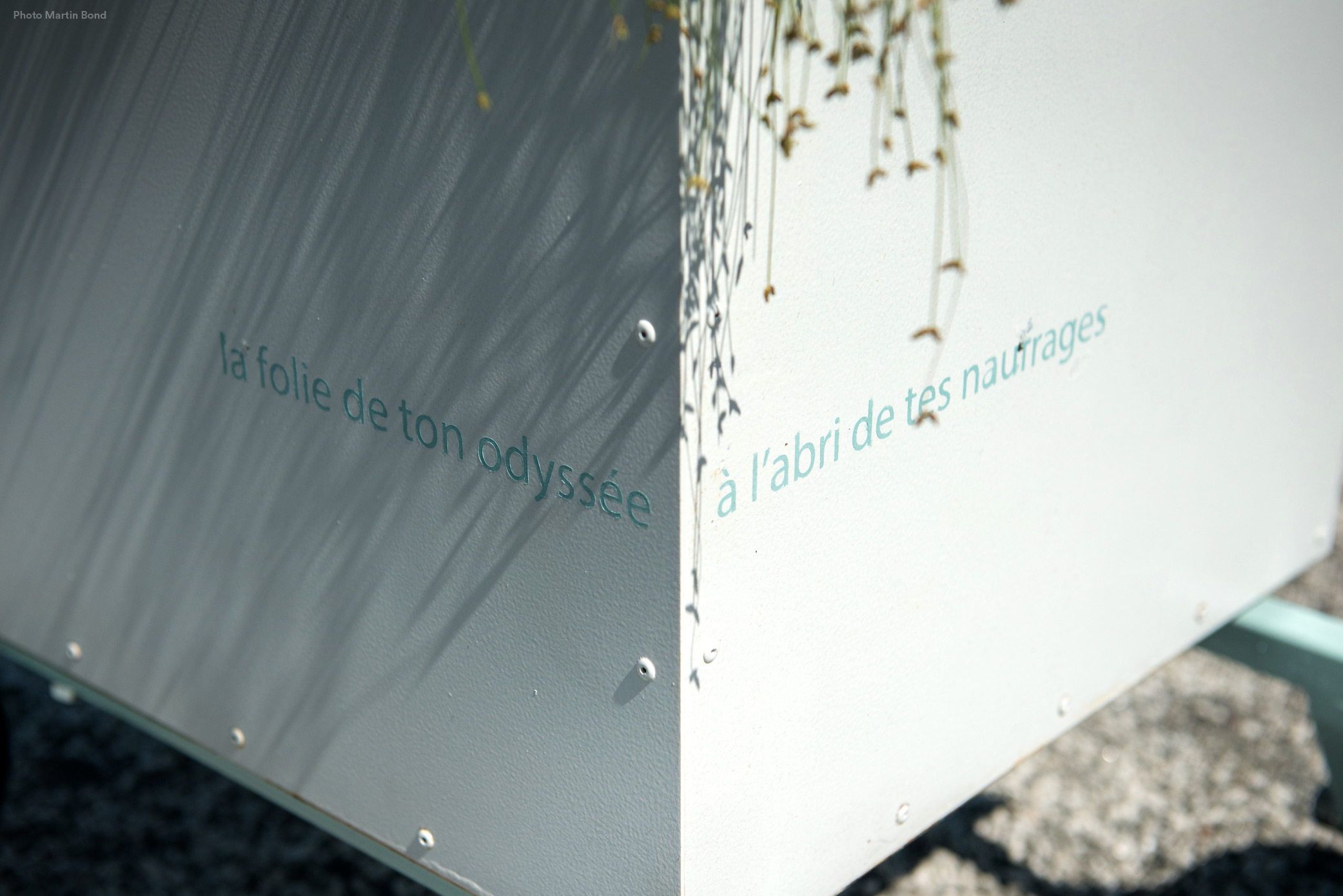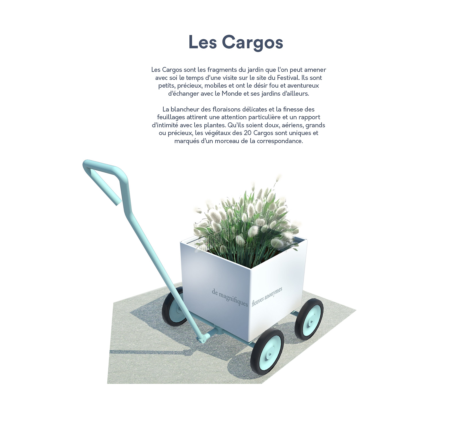 L’Escale est remplie de cargos prêts à rencontrer le vaste Monde. C’est un jardin en fragments, curieux, qui rêve à l’Ailleurs, à l’étrange, au géant, à l’inconnu. Le visiteur est le complice de ses souhaits les plus fous. Ils deviennent partenaire de jeu et d’exploration le temps de la visite sur le site du festival. Les deux voyageurs prennent soin l’un de l’autre, comme un dialogue vital, nécessaire et intimiste. Sur chaque cargo est écrit le fragment d’une correspondance, le dialogue d’une rencontre rêvée entre deux jardins lointains.