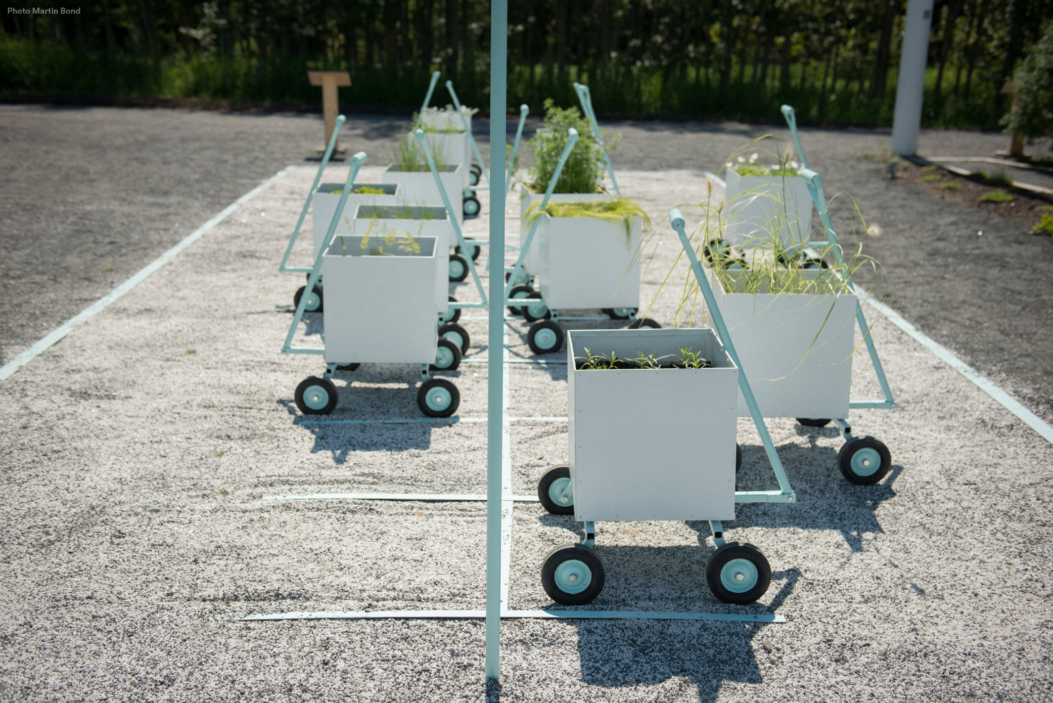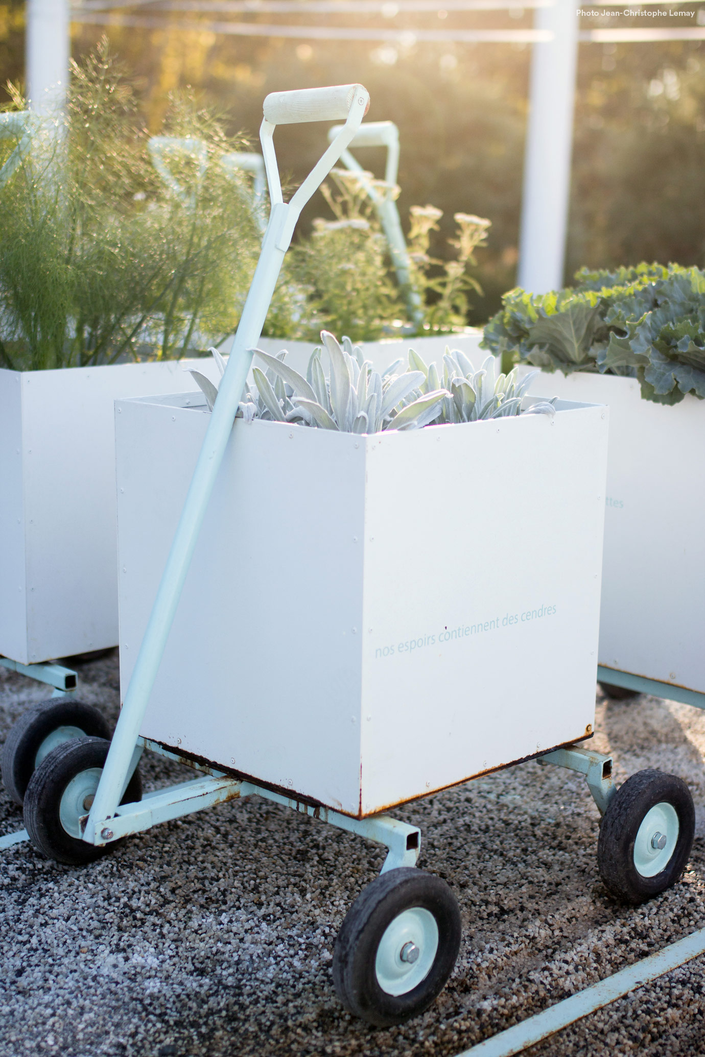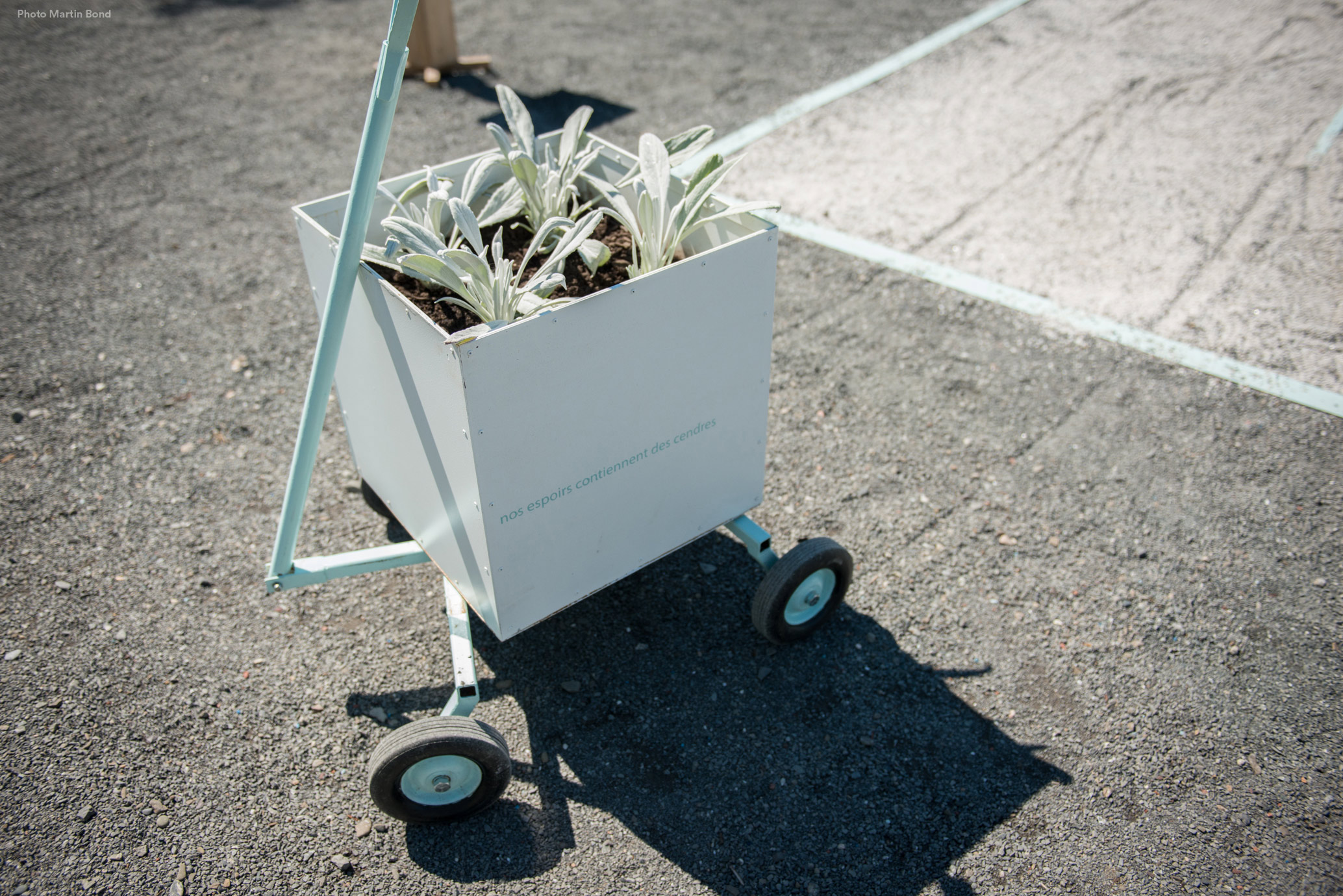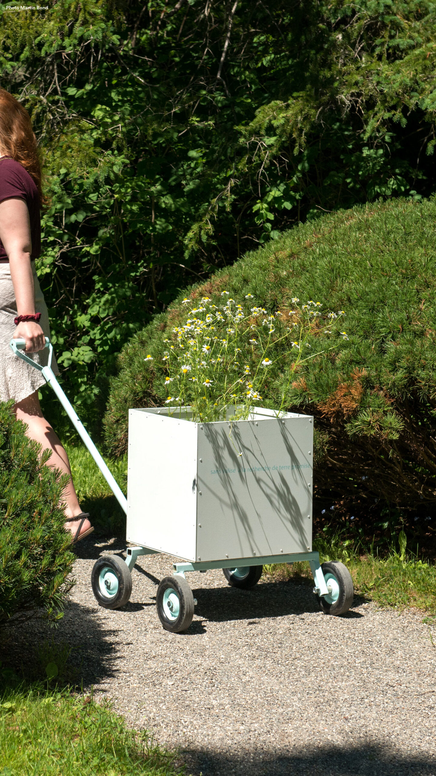 L’Escale est un jardin mobile, fractionné, en quête d’exploration. C’est un  jardin de compagnie, un jardin d’essentiel : nourricier, médicinal ou ornemental. Un petit lopin de terre sur roulettes qu’on choisit, qu’on adopte et qu’on emporte avec soi. Un précieux. Une sorte de navire qui change de mains selon les allées et venues des visiteurs.