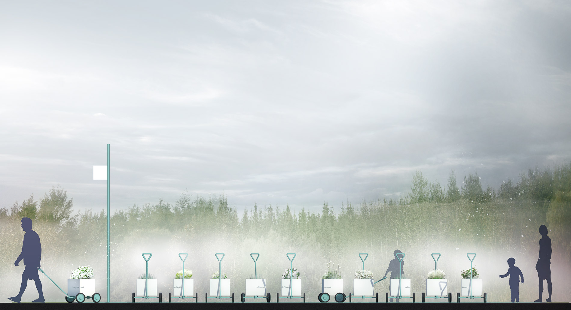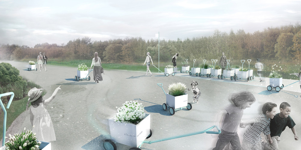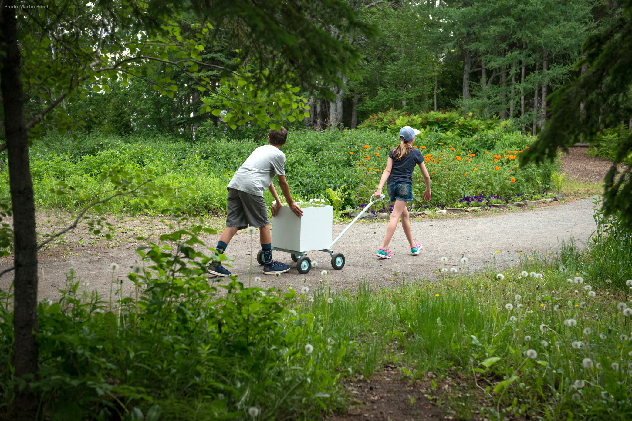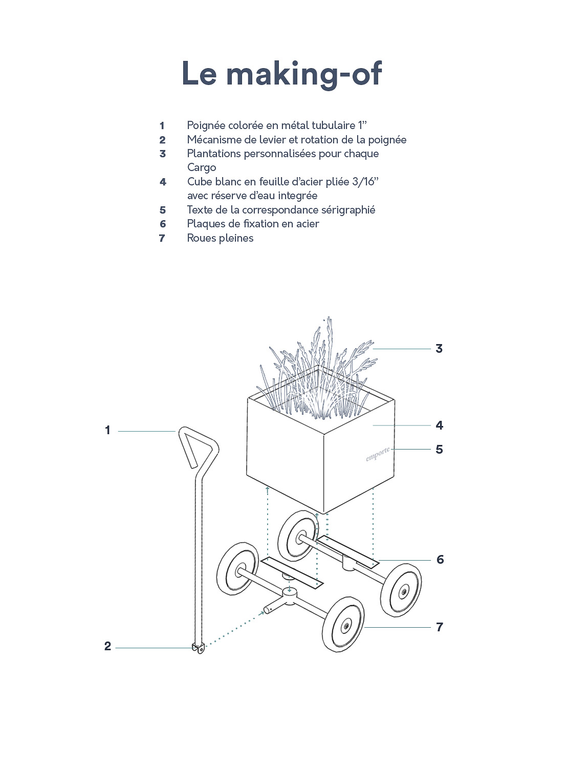 L’Escale est un jardin mobile, fractionné, en quête d’exploration. C’est un  jardin de compagnie, un jardin d’essentiel : nourricier, médicinal ou ornemental. Un petit lopin de terre sur roulettes qu’on choisit, qu’on adopte et qu’on emporte avec soi. Un précieux. Une sorte de navire qui change de mains selon les allées et venues des visiteurs.