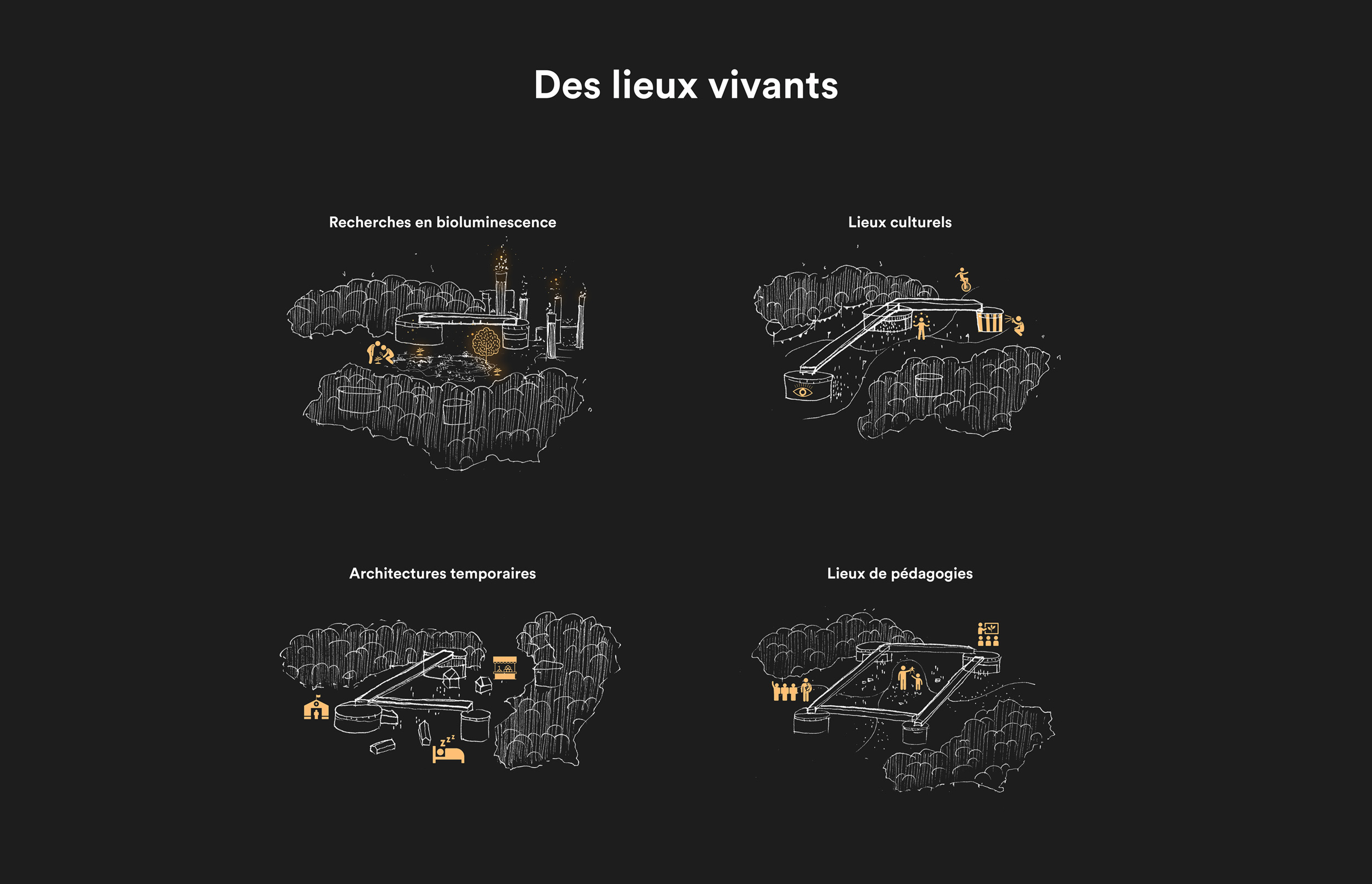 Notre laboratoire est une fable sur la lumière. Elle révèle les ruines d’un empire qui s’est éteint comme tant d’autres, arrivé au terme de ses ressources. L’arrivée de la recherche en bioluminescence, l’utilisation des cuves comme lieux culturels et pédagogiques ou comme architecture transitoire transforme le site en un lieu unique au monde, vivant et harmonieux. Le monstre de lumière respire toujours. Les lucioles et les fougères bioluminescentes ont remplacé ses flammes. Endormi, son énergie est belle et respectueuse de son environnement. Ses paysages forment une nouvelle nature étrange, étincelante, colorée et joyeuse.
