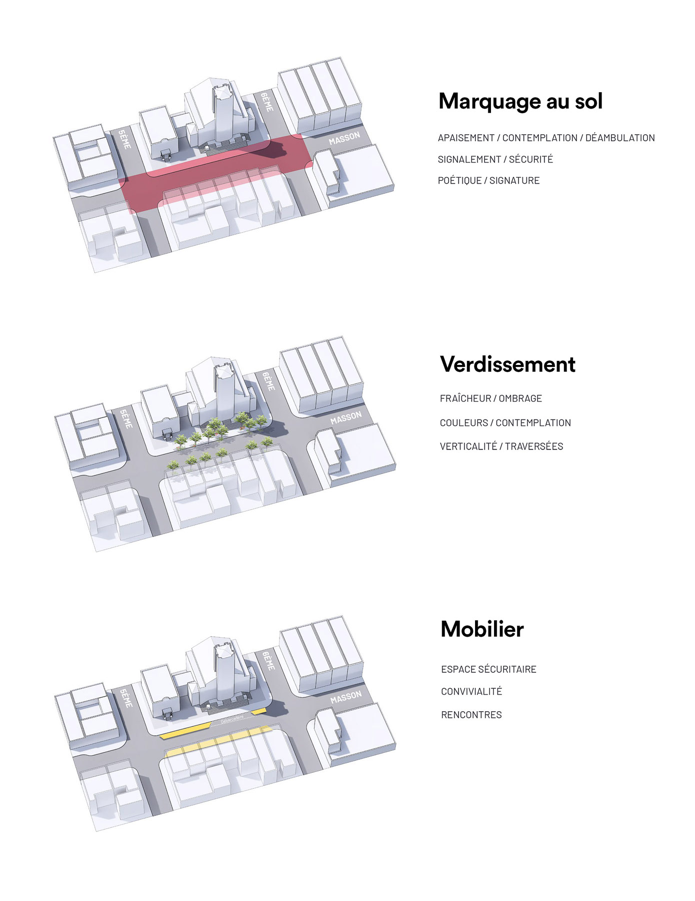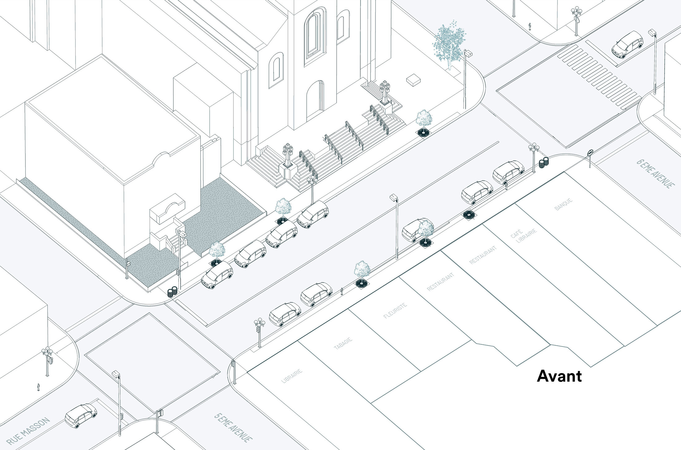La nouvelle place publique répond aux besoins spécifiques des aménagements transitoires du Parvis de l’église Saint-Esprit-de-Rosemont et ses abords, dans le cadre du Programme d’implantation de rues piétonnes et partagées (PIRPP). Cette église d’un gabarit imposant, avec sa volée de marches et son parvis invite à ralentir le rythme, et de prendre le temps de se rassembler. La nouvelle implantation crée un lieu invitant, ouvert, confortable, sécuritaire et végétalisé, tout en restant léger dans les aménagements physiques. Les places que créent naturellement les devantures d’églises révèlent la mission de coeur de la communauté. Ces espaces à mettre en valeur sont des potentiels énormes pour se réapproprier la ville à l’échelle du quartier.