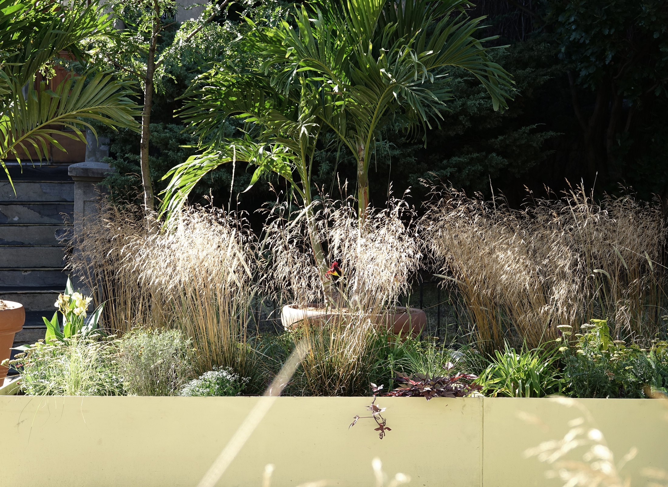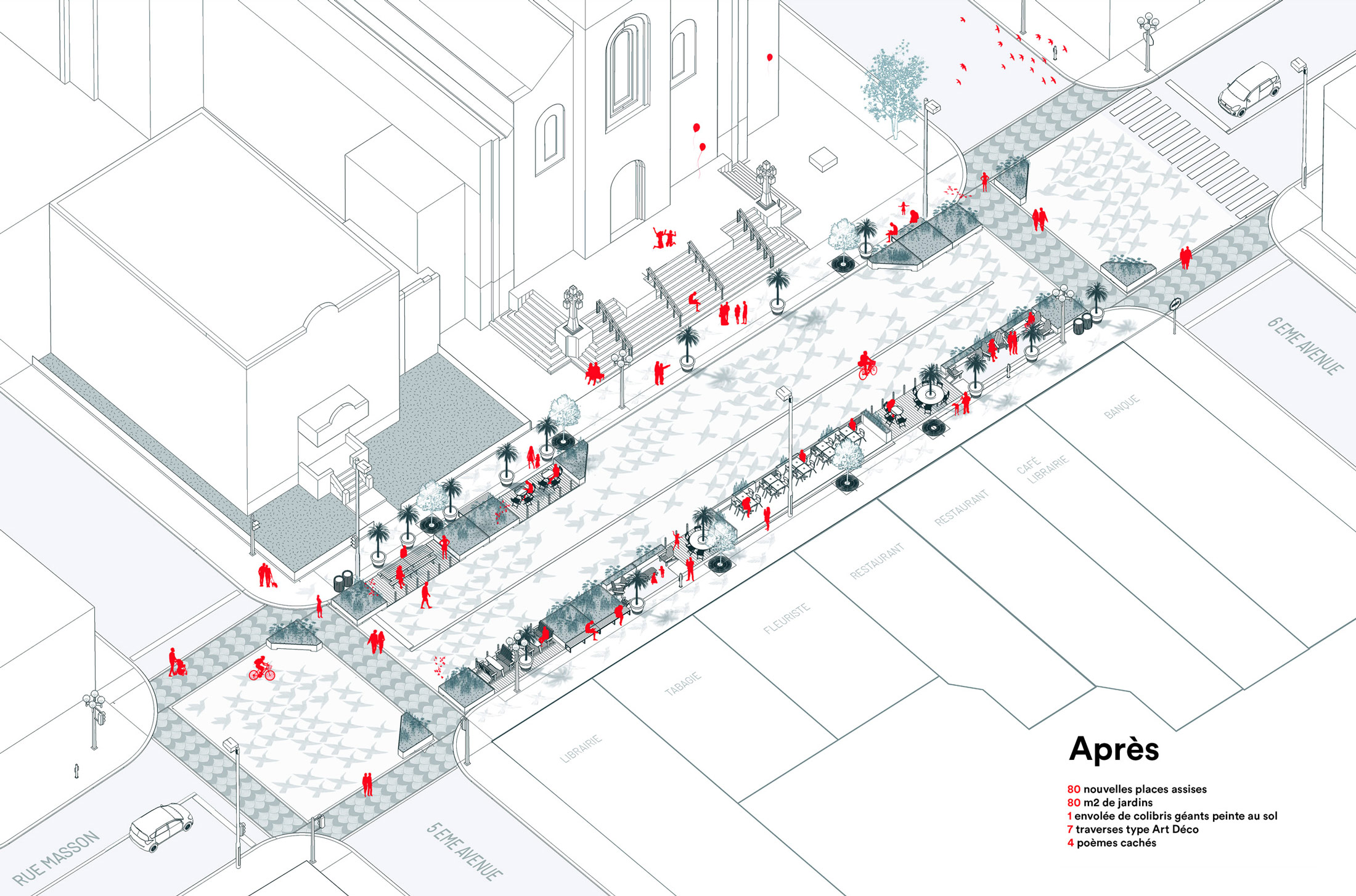 Le concept de la place découle du riche patrimoine art déco de l’église St-Esprit. Nous avons porté notre attention sur ses formes et ses ornements. Le motif en éventail qui revient à la fois en façade et à l’intérieur de l’église reprend la forme d’une feuille de palmier mais aussi celle d’une plume. C’est précisément autour de ce motif que nous avons développé notre concept. La couleur étant un élément important du style art déco, nous avons imaginé une place publique comme une grande fête colorée où il fait bon vivre et observer les oiseaux, à l’ombre des cocotiers.