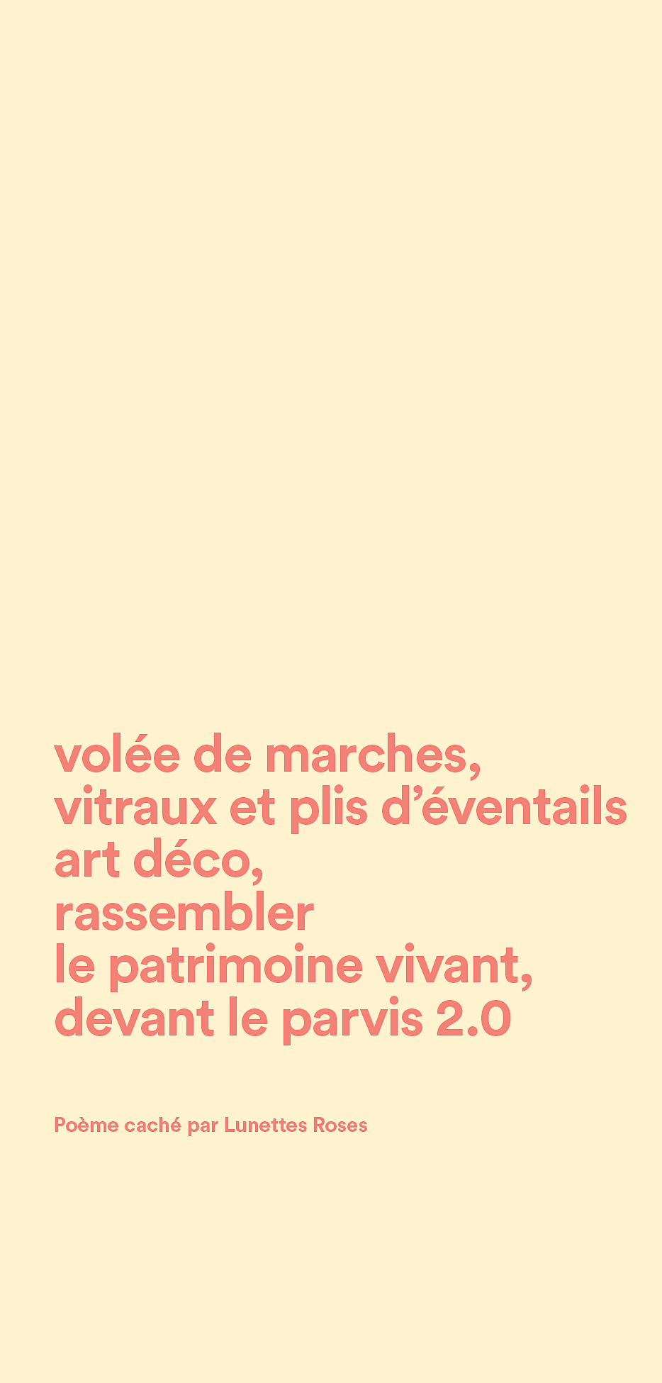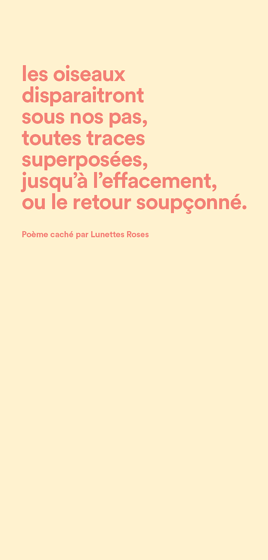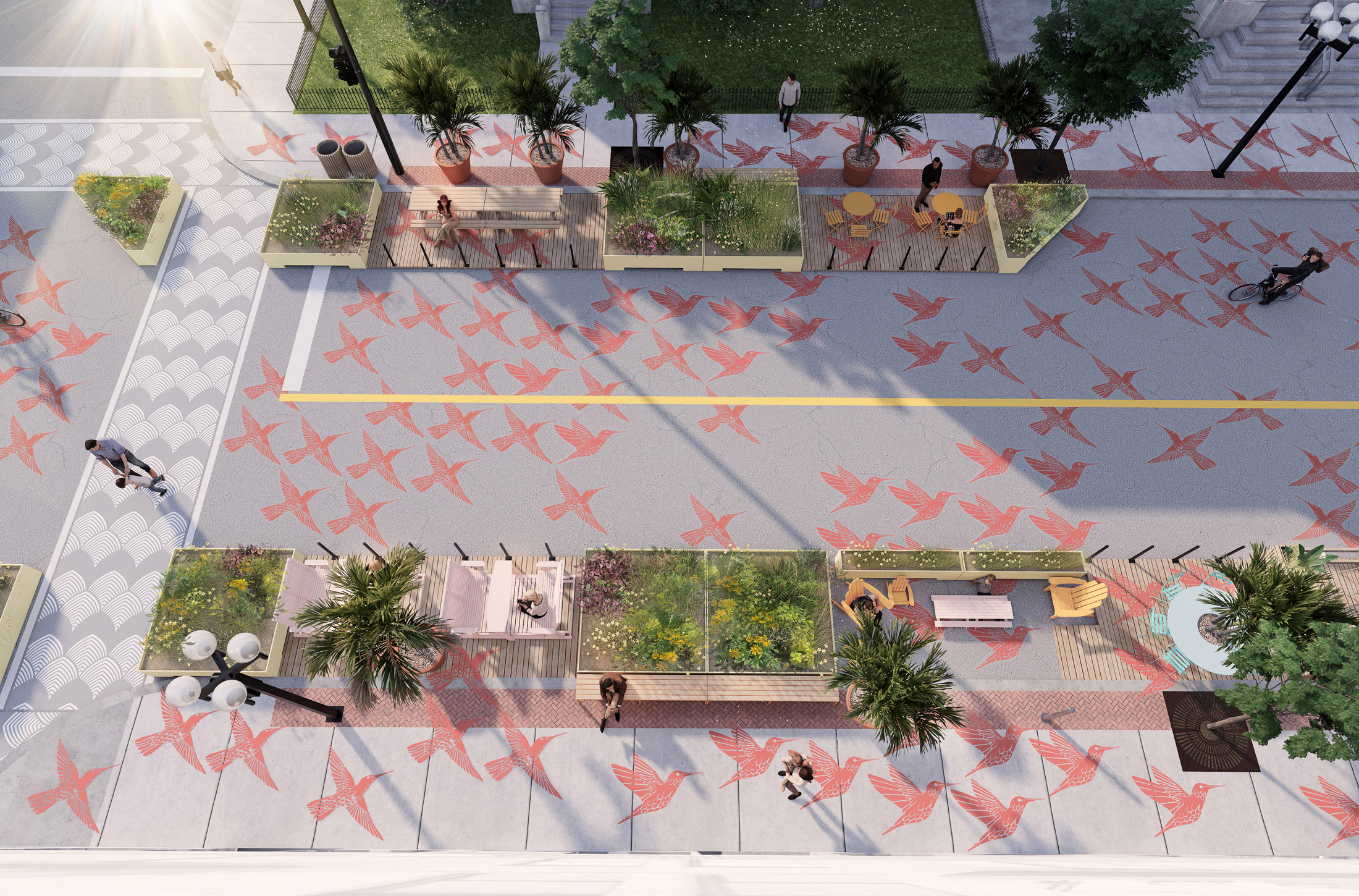 linéaires, deux balancelles, trois tables à pique-nique, onze chaises Adirondack, trois tables et dix-sept chaises bistro. 4 poèmes cachés spécialement conçus pour l’installation apporte singularité, rêverie et contemplation à la nouvelle place publique. Des grands jardins sont installés afin d’amener couleurs, joies, délicatesses et bio-diversité dans cet environnement. Le motif au sol représente une envolée de colibris géants, directement inspiré des formes du style Art Déco. Comme un tapis confortable de maison, le troupeau d’oiseaux amènent une signature distinctive à la place et une sensation d’unité dans le coeur de village. L’Envolée est vouée à disparaître et à migrer ainsi sous les pas des passants et des moteurs. Le temps d’une sieste, d’une danse, d’un café ou d’un mariage.