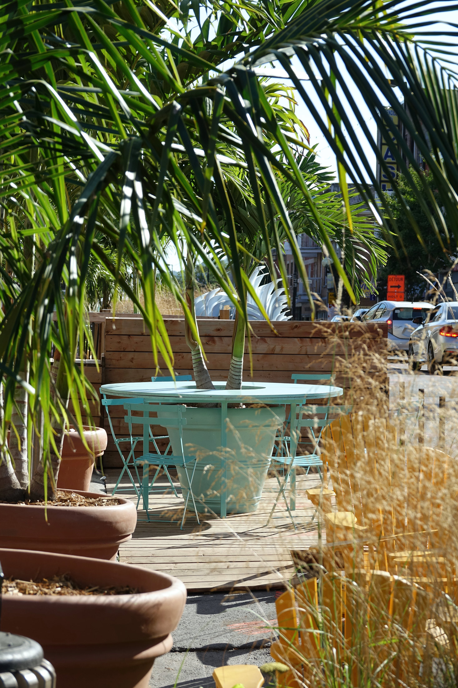 Respectant les normes d’accessibilité universelle, l’aménagement présente huit zones différentes comptabilisant plus de 80 places assises. Les pièces de mobilier mises à la disposition des usagers de l’artère commerciales sont : deux tables hautes, quatre bancs
