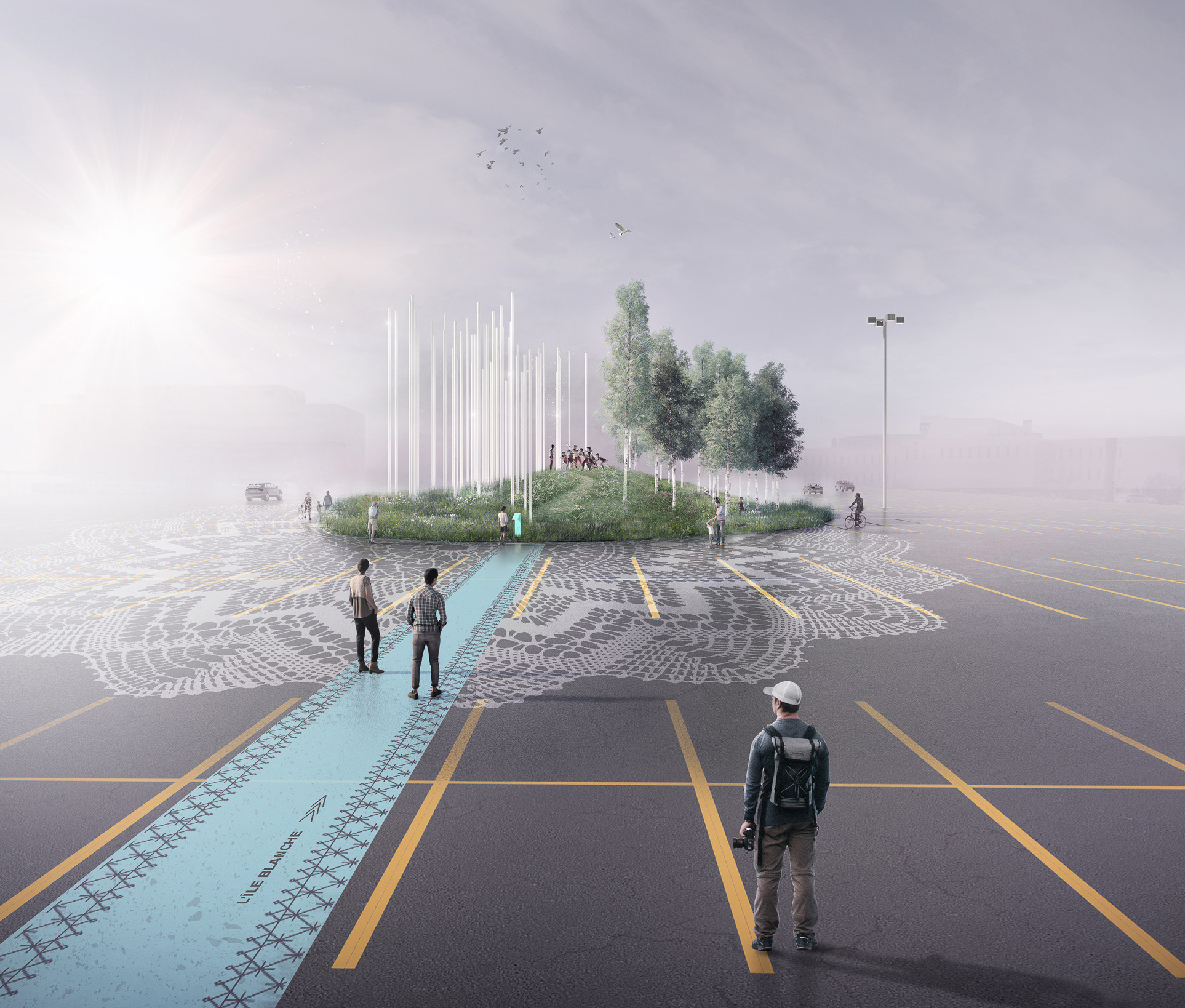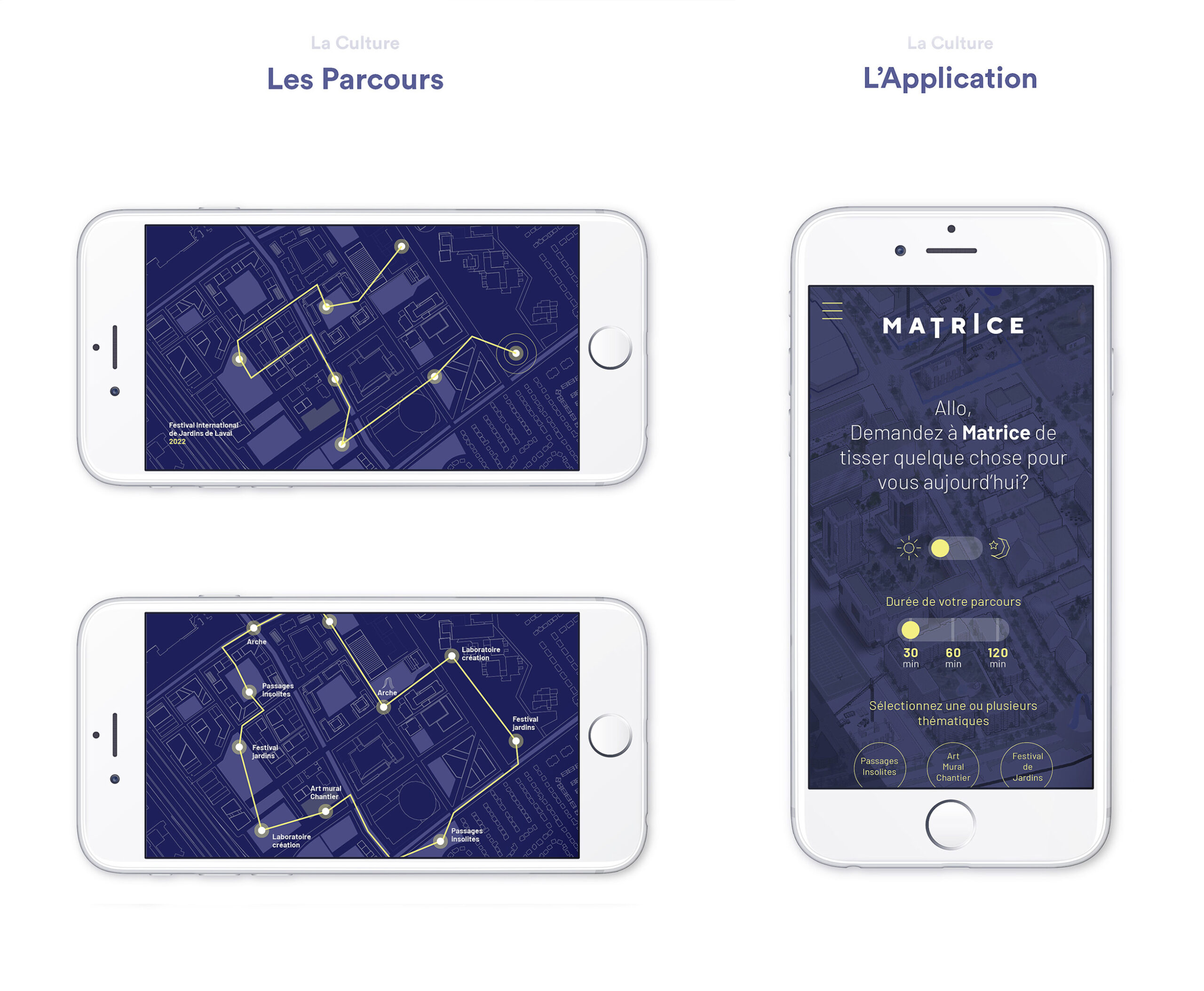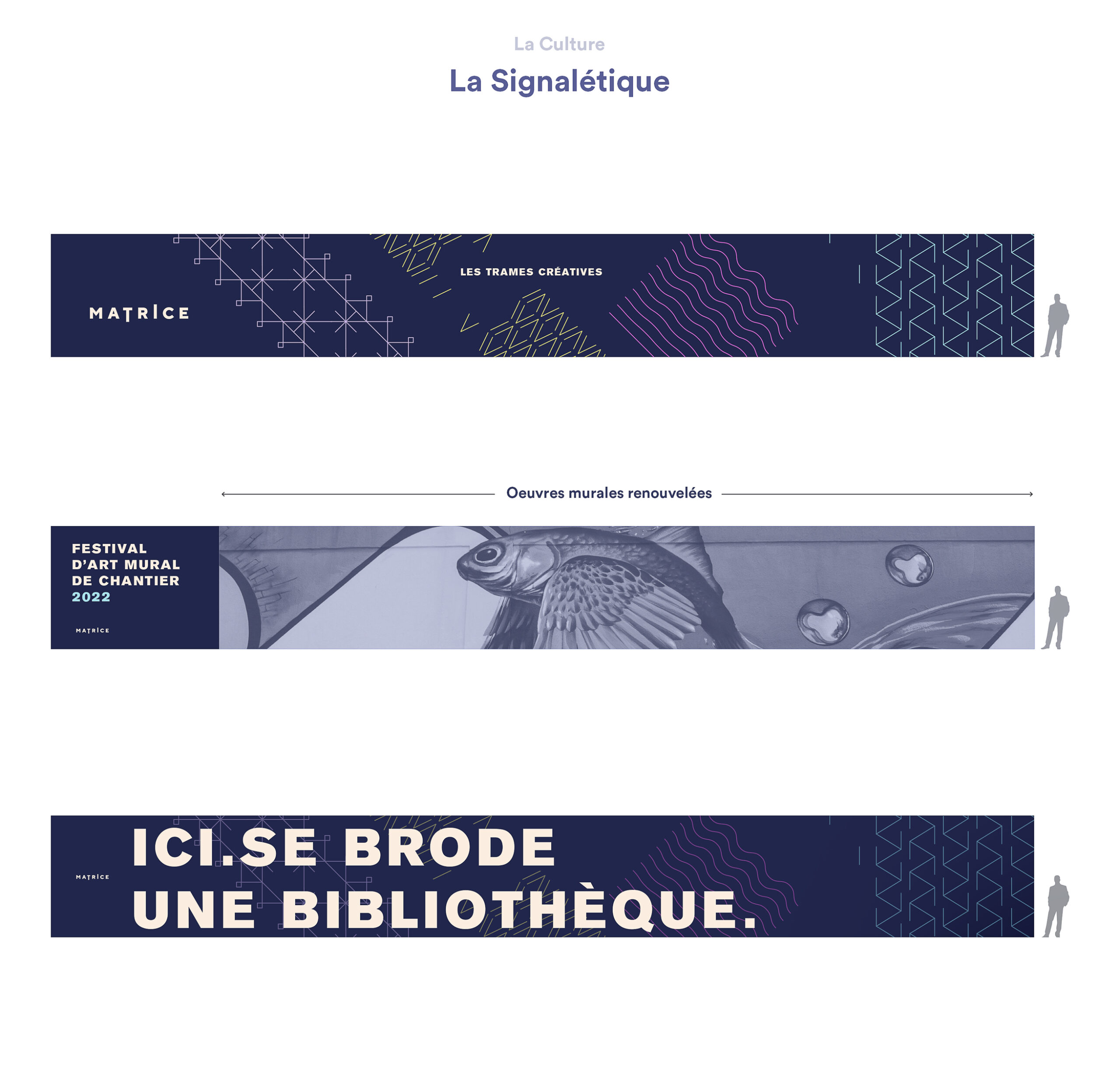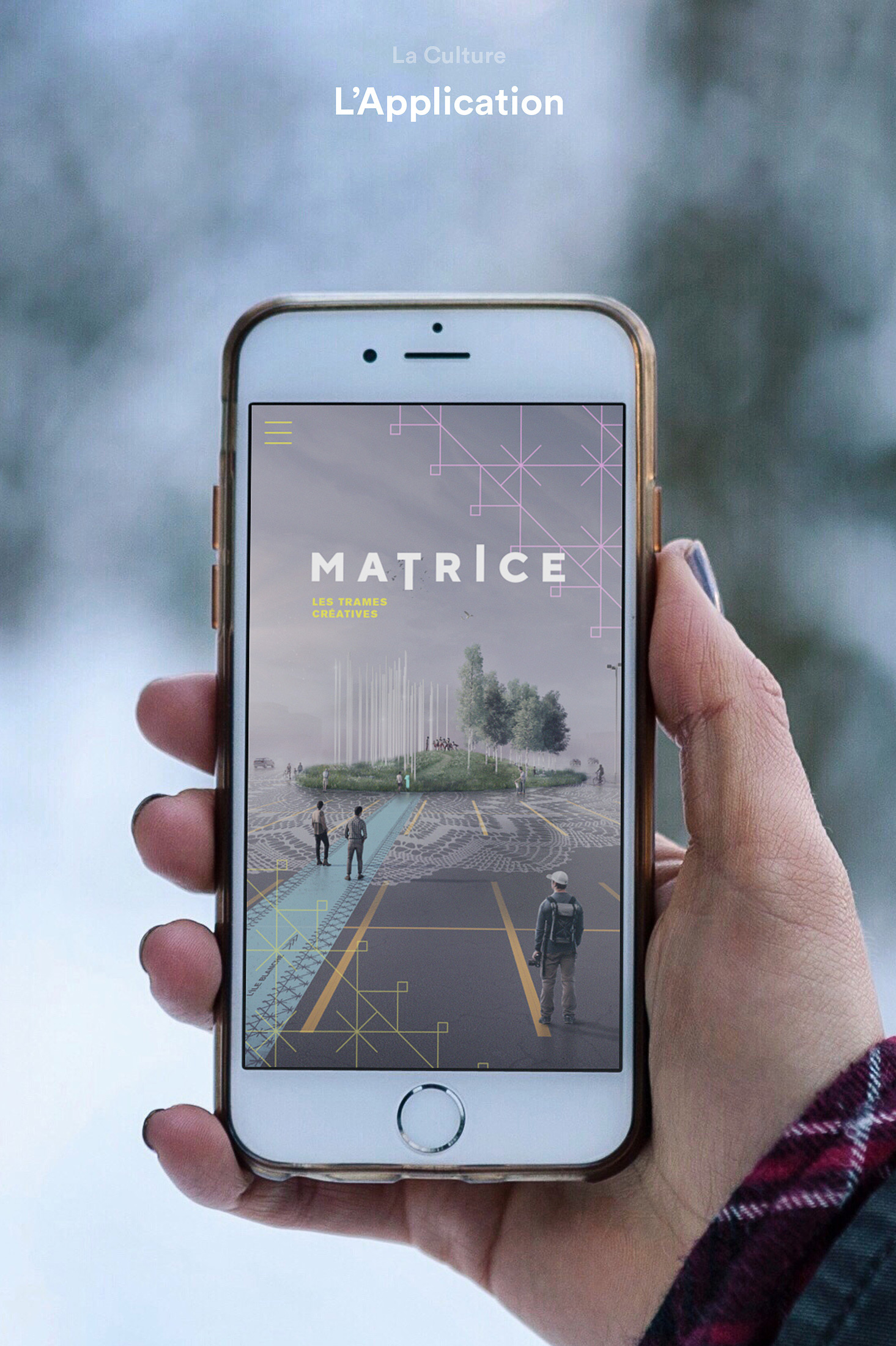 Imaginons cet instrument comme une force bienveillante qui habite le sol lavallois depuis toujours et qui jaillit de terre. Cet outil a façonné le territoire à travers les époques. Comme sortie d’une légende, l’image de cette force fabuleuse demeure insaisissable. Toutefois, sa trace et son empreinte sont apposées un peu partout. Elle transforme et façonne le paysage. Comme une nouvelle mythologie, elle amène l’idée que le cœur de Laval ne s’est pas développé au hasard, ni tout dernièrement, au contraire, le cœur de Laval est habité et porteur de culture depuis des temps immémoriaux. L’inspiration au cœur du langage visuel des aménagements, qu’ils soient temporaires ou permanent, fait écho à la broderie. Il s’inspire des points de coutures et d’autres trames générées par un procédé de répétition. Il allie l’intervention sensible du geste manuel à celui de l’outil et du mécanisme. Les manifestations de Matrice sont sensibles, structurées et systématiques. L’ensemble de la signature visuelle découle de l’histoire d’une machine puissante et invisible qui laisse sa trace dans le paysage.