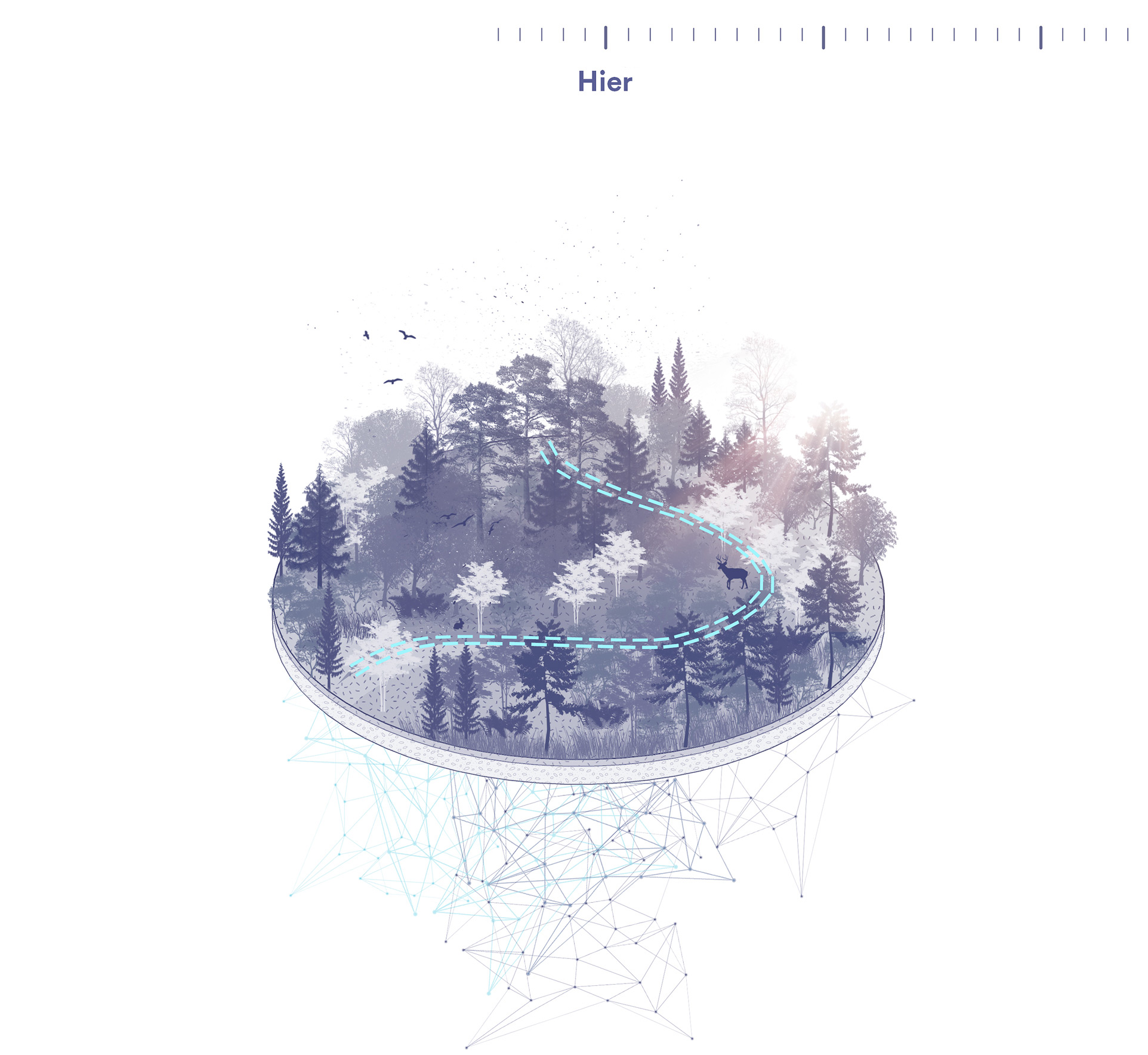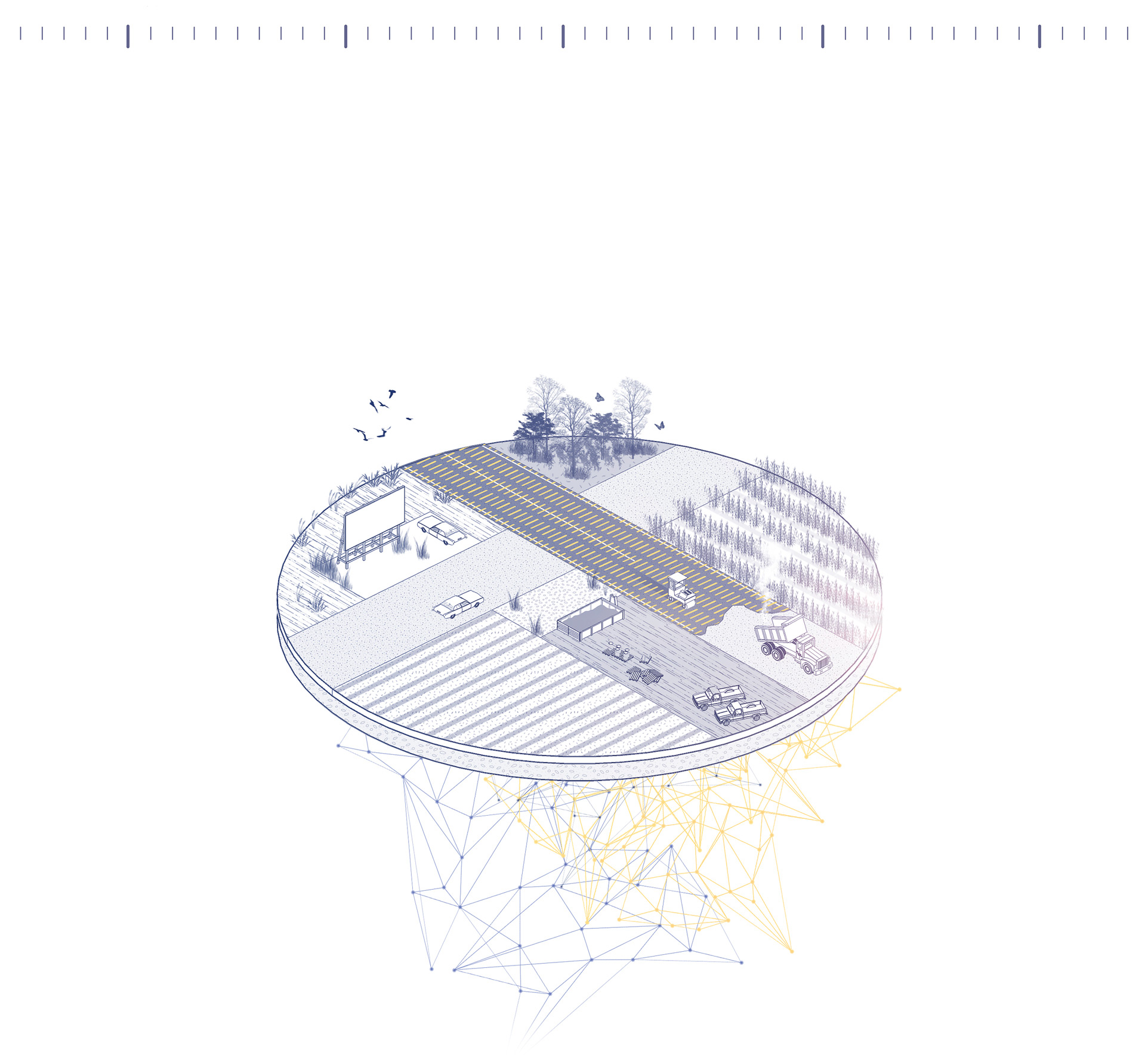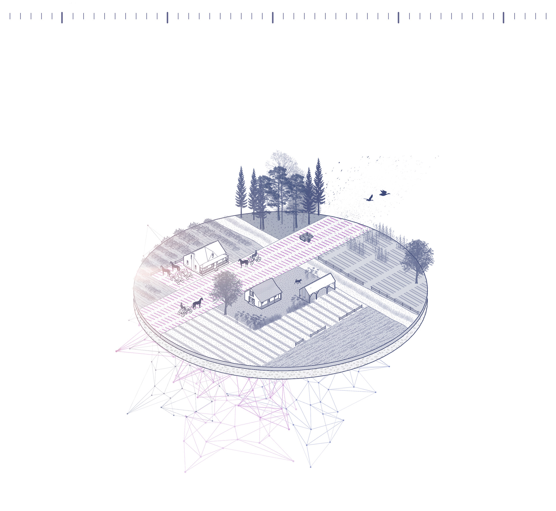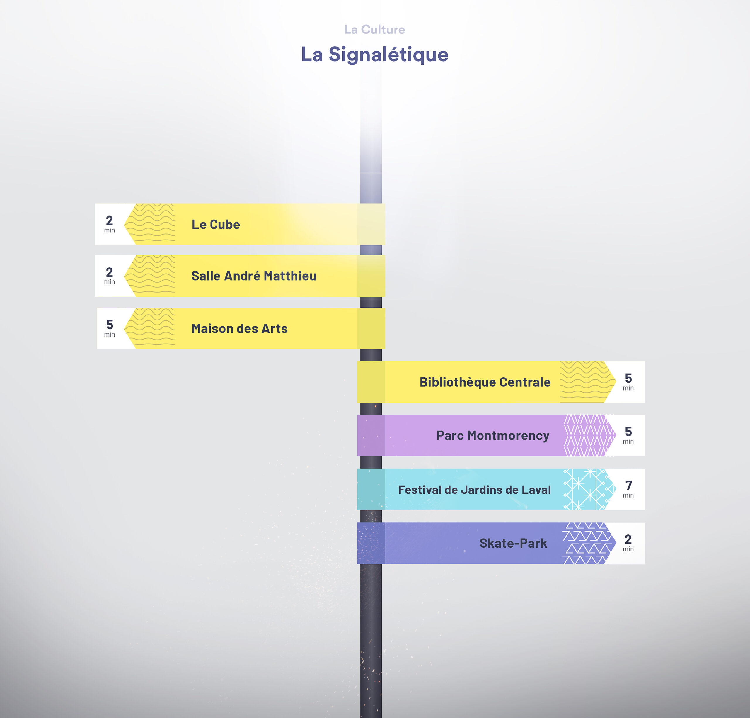 Imaginons cet instrument comme une force bienveillante qui habite le sol lavallois depuis toujours et qui jaillit de terre. Cet outil a façonné le territoire à travers les époques. Comme sortie d’une légende, l’image de cette force fabuleuse demeure insaisissable. Toutefois, sa trace et son empreinte sont apposées un peu partout. Elle transforme et façonne le paysage. Comme une nouvelle mythologie, elle amène l’idée que le cœur de Laval ne s’est pas développé au hasard, ni tout dernièrement, au contraire, le cœur de Laval est habité et porteur de culture depuis des temps immémoriaux. L’inspiration au cœur du langage visuel des aménagements, qu’ils soient temporaires ou permanent, fait écho à la broderie. Il s’inspire des points de coutures et d’autres trames générées par un procédé de répétition. Il allie l’intervention sensible du geste manuel à celui de l’outil et du mécanisme. Les manifestations de Matrice sont sensibles, structurées et systématiques. L’ensemble de la signature visuelle découle de l’histoire d’une machine puissante et invisible qui laisse sa trace dans le paysage.