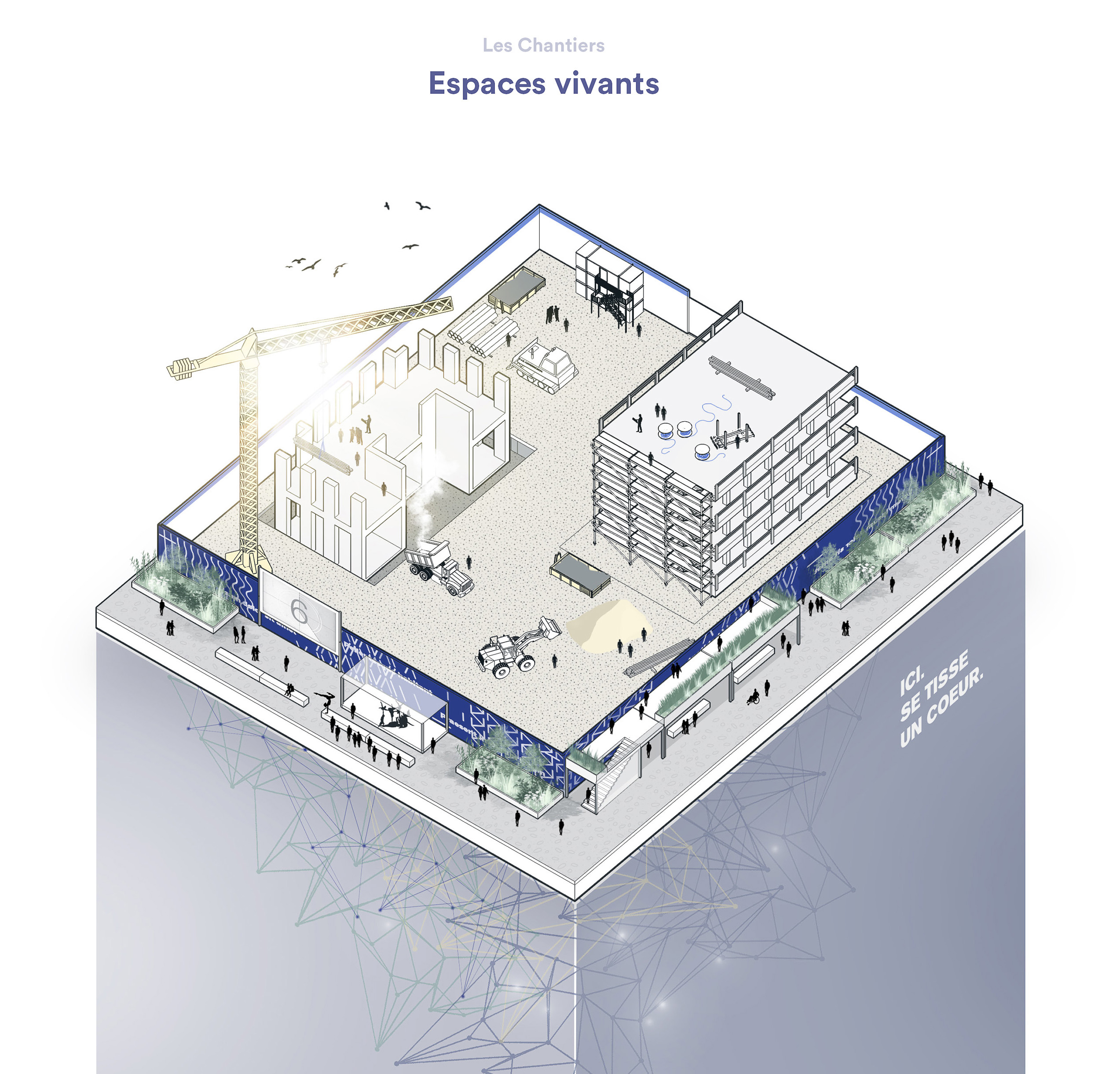 Chaque créateur a son outil de travail. Quel instrument sert à forger le coeur d’une ville? Et si sous les terres habitées lavalloises existe une machine mythique œuvrant comme un outil à tisser le drapé des villes à une échelle humaine. Au travers cette trame narrative, le concept Matrice propose une genèse et un récit.