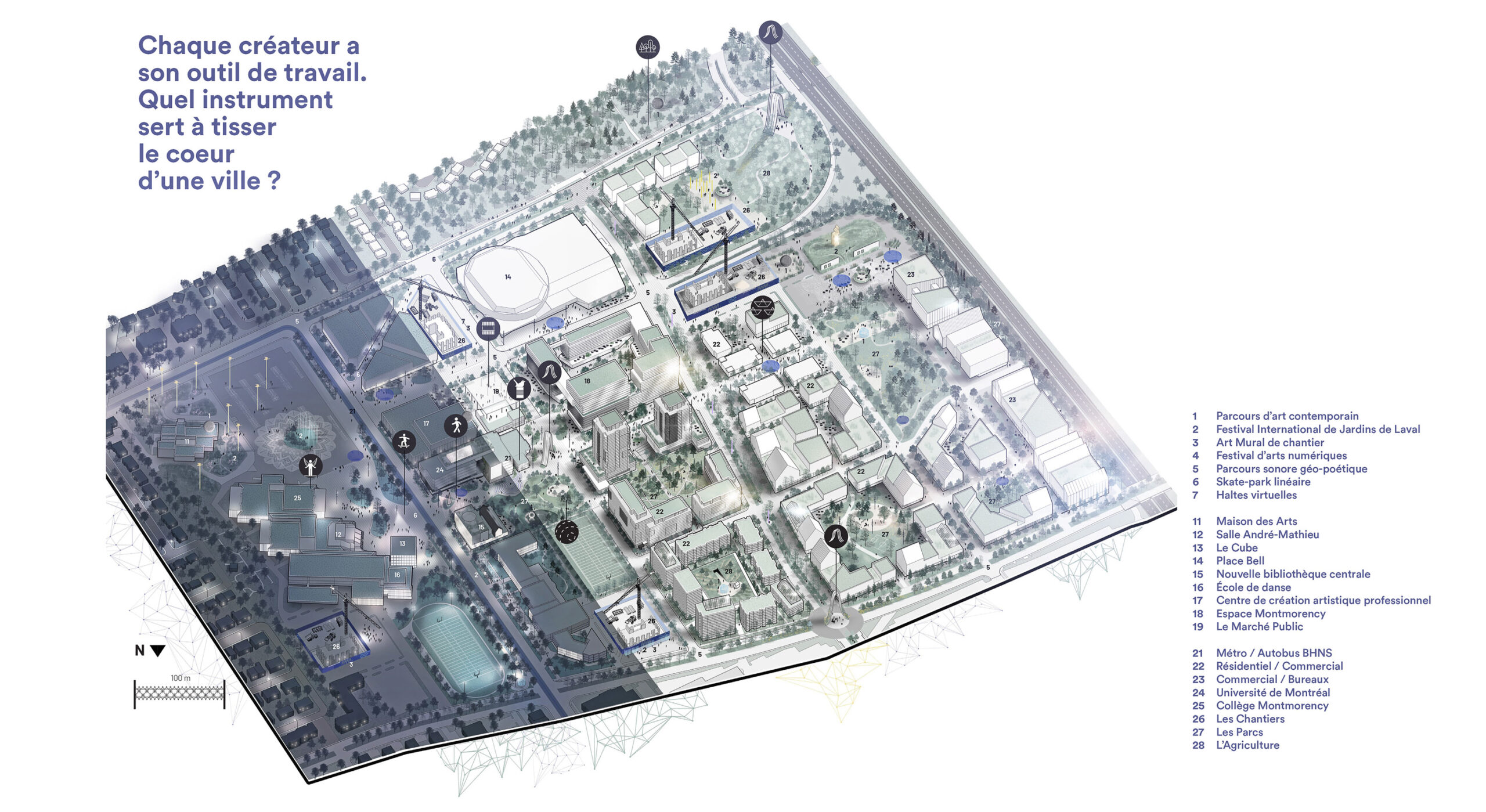 Matrice intègre les différents pôles culturels du centre ville, présents et futurs en répondant à des besoins. En impliquant les différents organismes culturels, Matrice permet de se reproduire et de se déployer au fil du temps en tissant des liens de proximité entre les résidents, les artistes et les commerçants. En détournant l’image des machines qui ont façonné le secteur Montmorency actuel, Matrice répond à une urgence de ré-humaniser le quartier. C’est un instrument qui laisse place aux citoyen-ne-s en faisant germer la culture et en tissant un cœur de ville à l’échelle humaine.