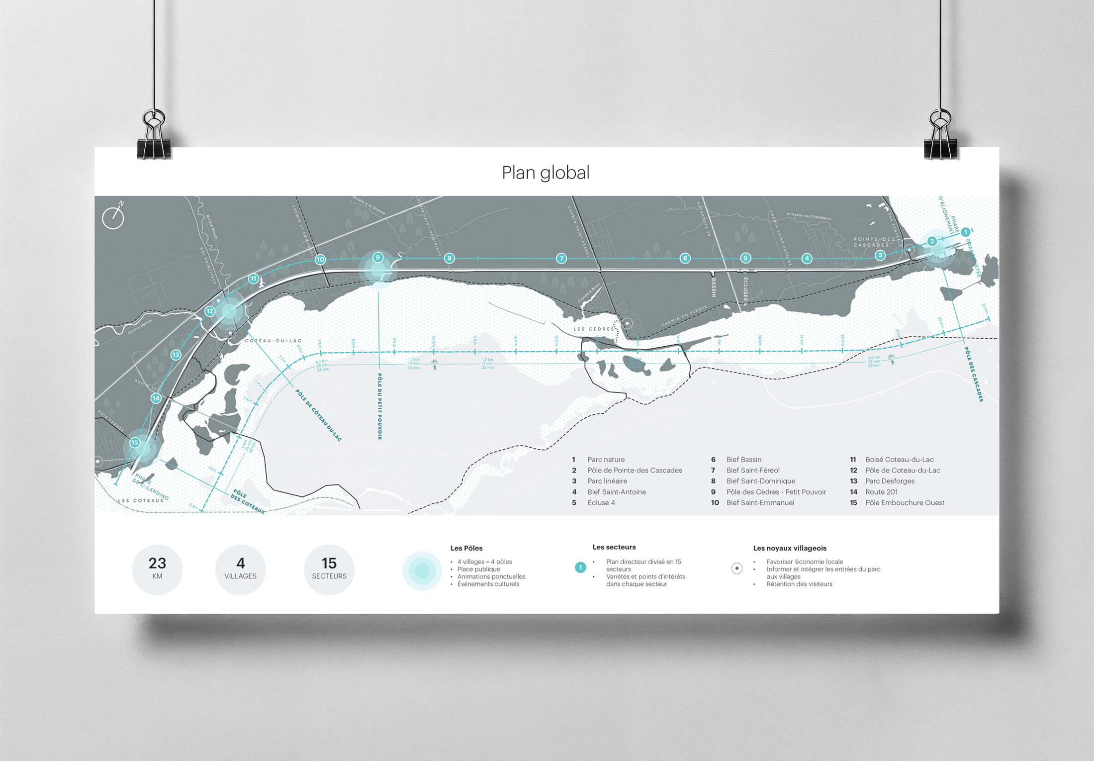 Enfin, le plan directeur affirme le rôle structurant du canal à l’échelle régionale. Intégré au tissu urbain et aux réseaux cyclables et touristiques de Vaudreuil-Soulanges, il devient un axe de rayonnement et d’identité territoriale. Loin d’être un simple espace de passage, le canal de Soulanges est repensé comme un lieu de rassemblement et d’inspiration, un paysage habité qui relie les communautés par la culture, la nature et le design. Le projet incarne une vision d’avenir où la mémoire du territoire se conjugue au présent pour offrir aux générations futures un patrimoine vivant et partagé.