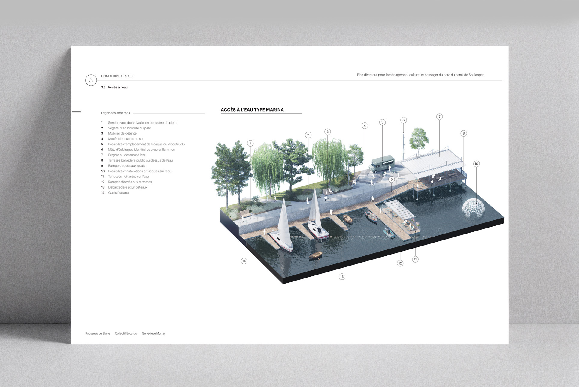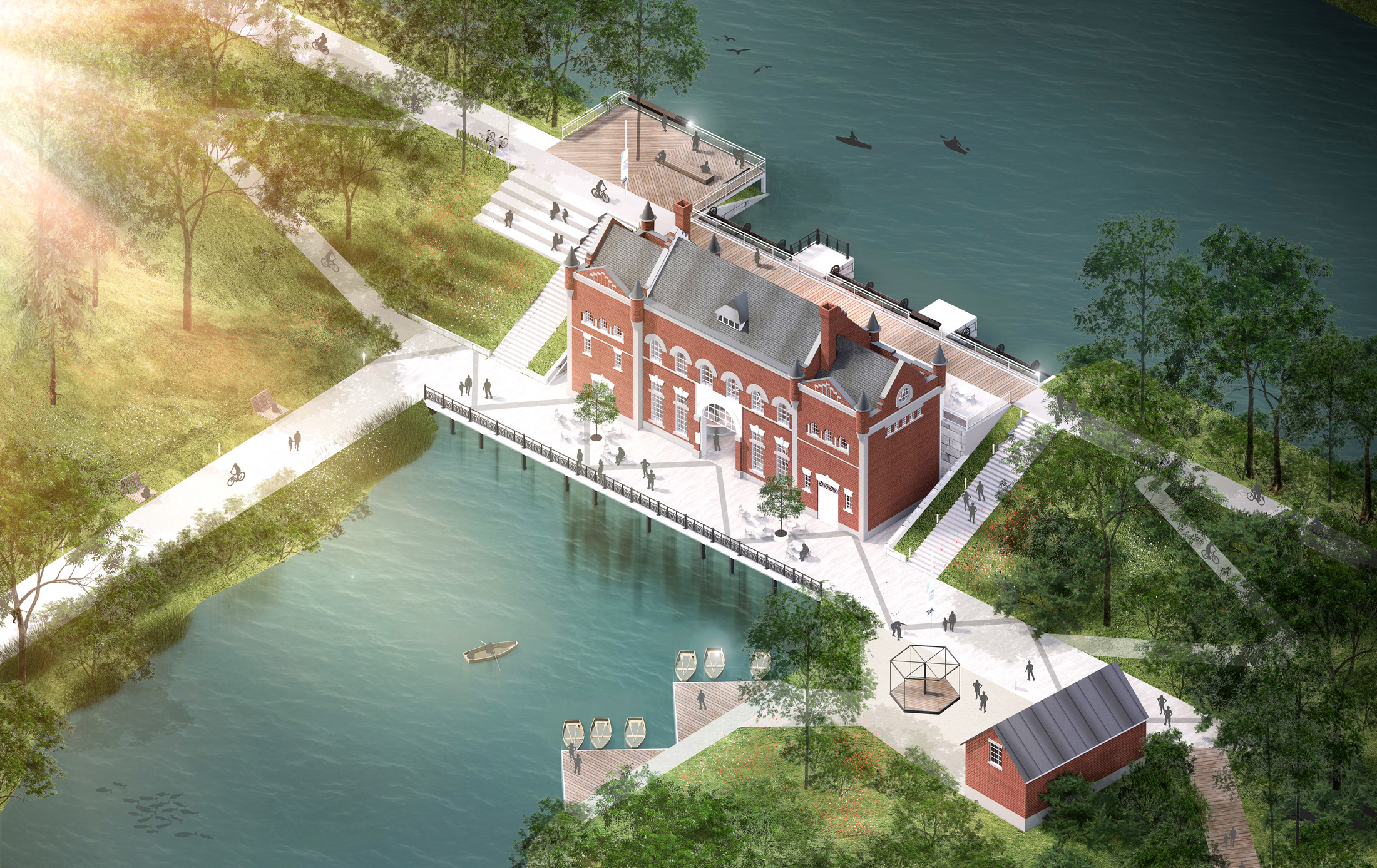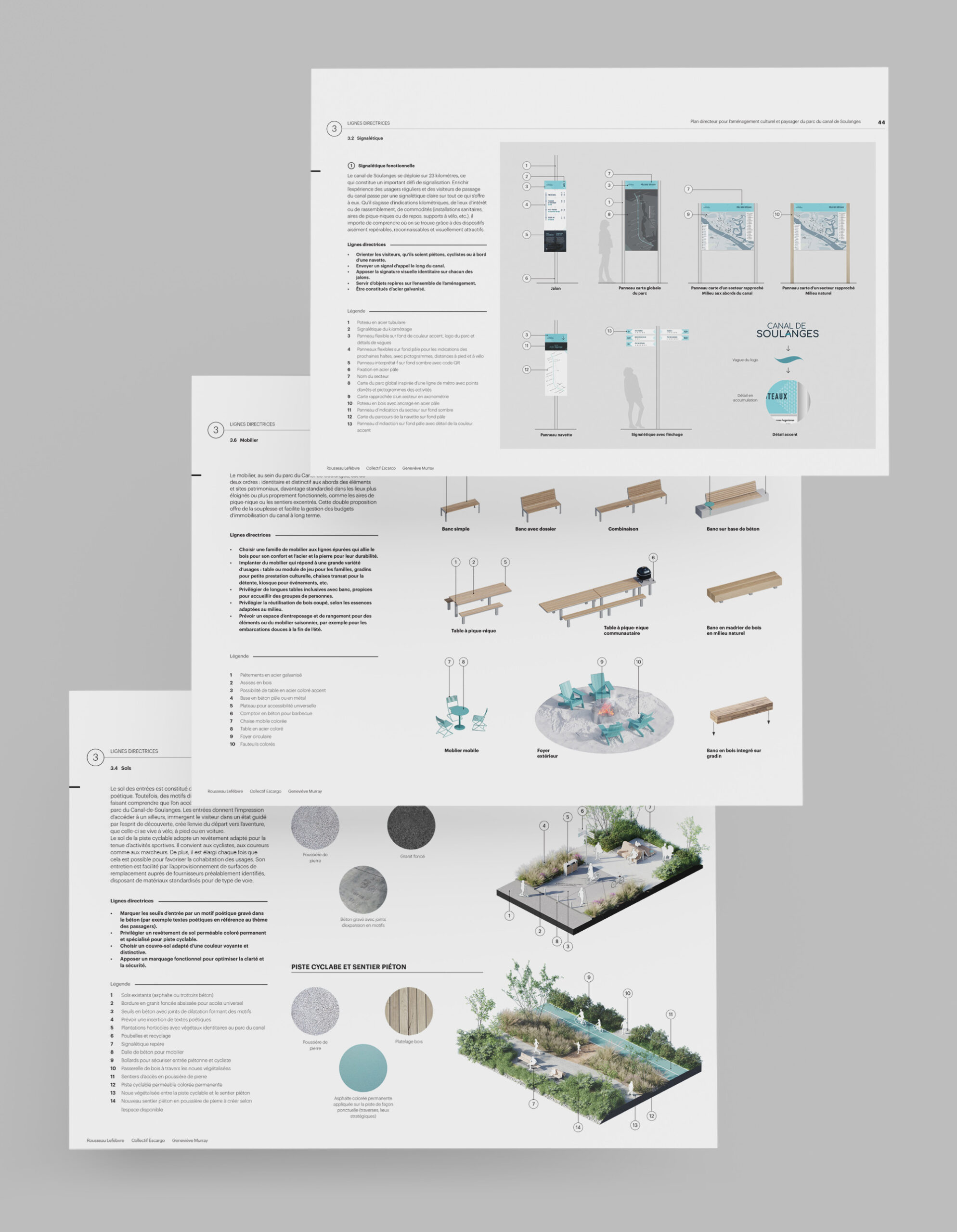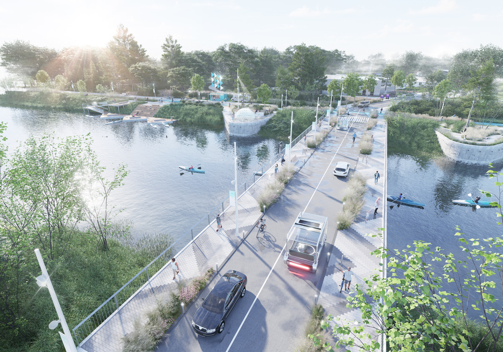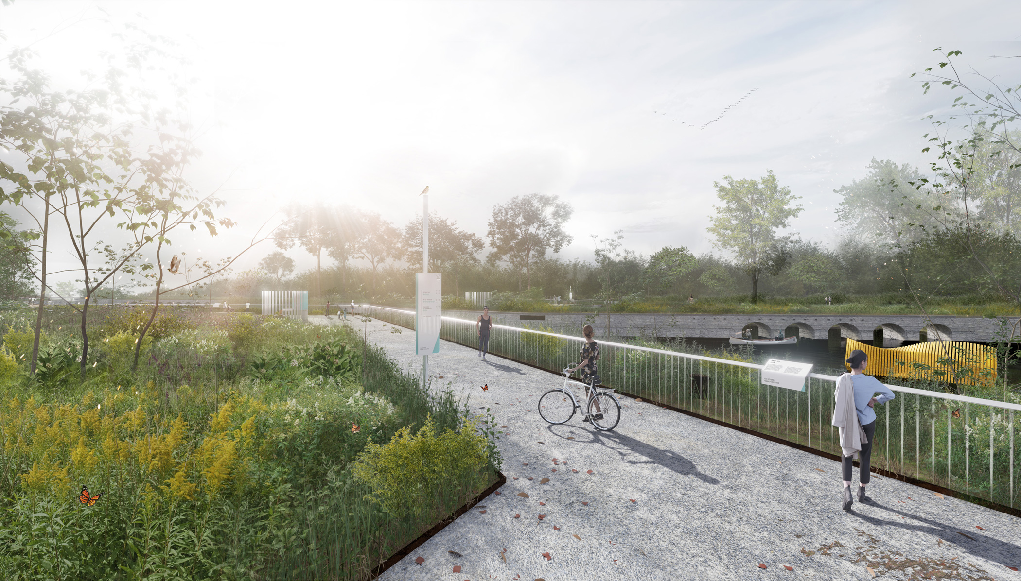 L’accessibilité et l’identité visuelle sont au centre de la démarche. Le plan directeur imagine un canal lisible et accueillant, dont la signalétique, le mobilier et les matériaux participent à la création d’une signature forte et cohérente. Bois clair, métal noir, pierre et accents de vert aqua évoquent à la fois le patrimoine nautique du lieu et une esthétique contemporaine. Des portes d’entrée claires, des pavillons d’accueil et des pôles d’animation facilitent l’orientation tout en créant des lieux de rencontre. Le canal devient un espace fluide, accessible aux piétons, cyclistes et plaisanciers, où le design soutient le confort et la convivialité.
