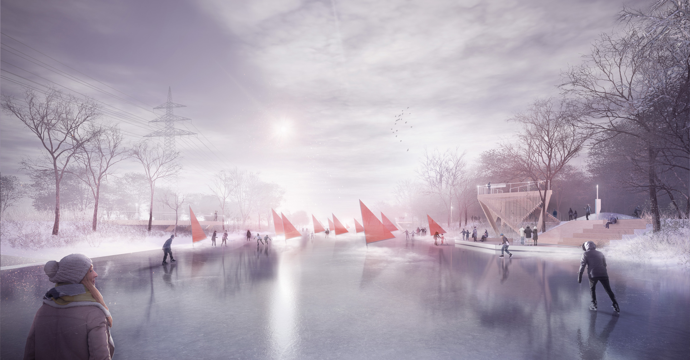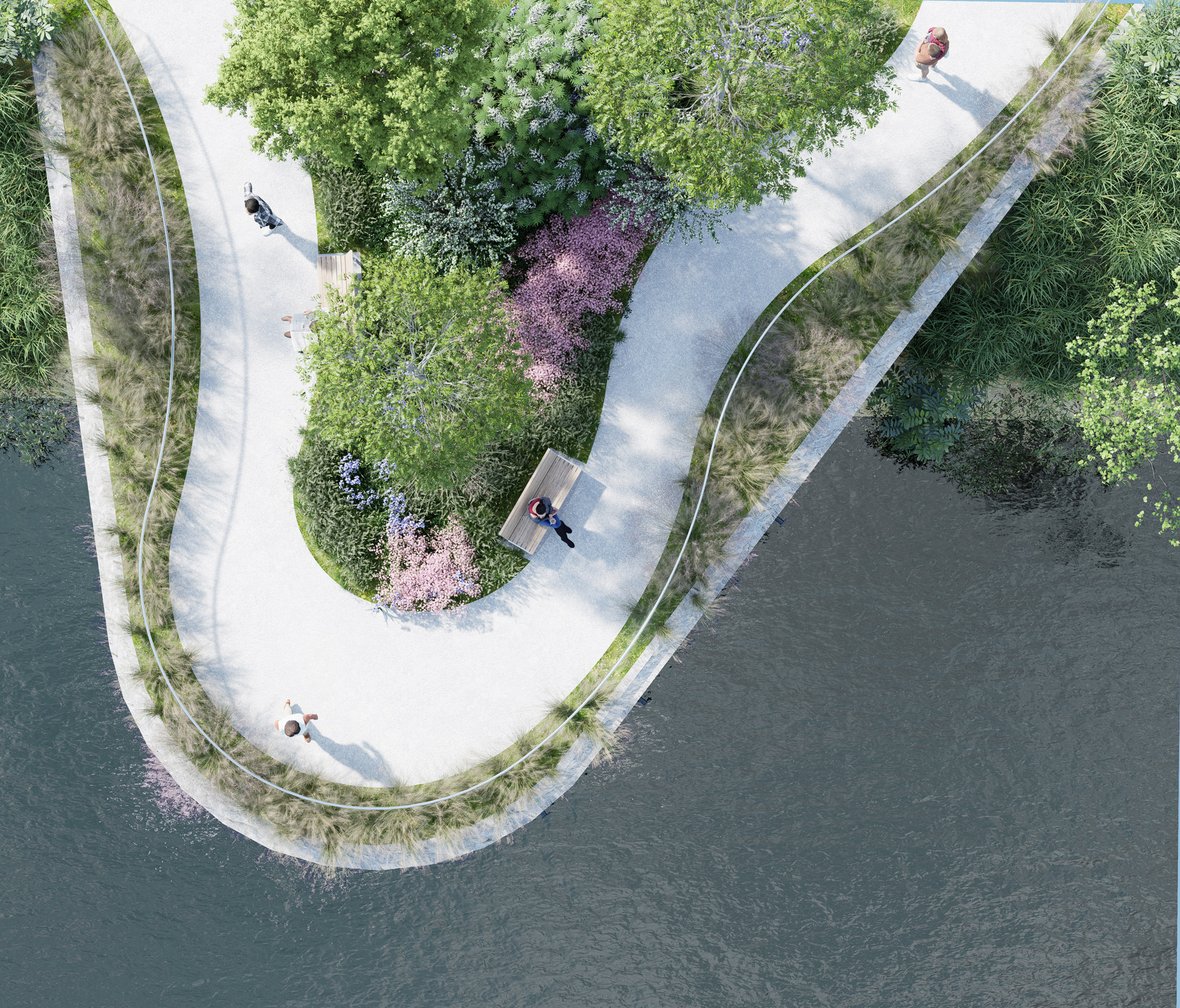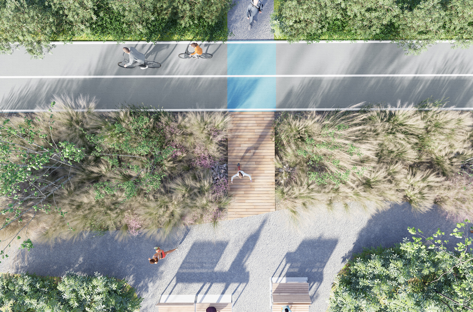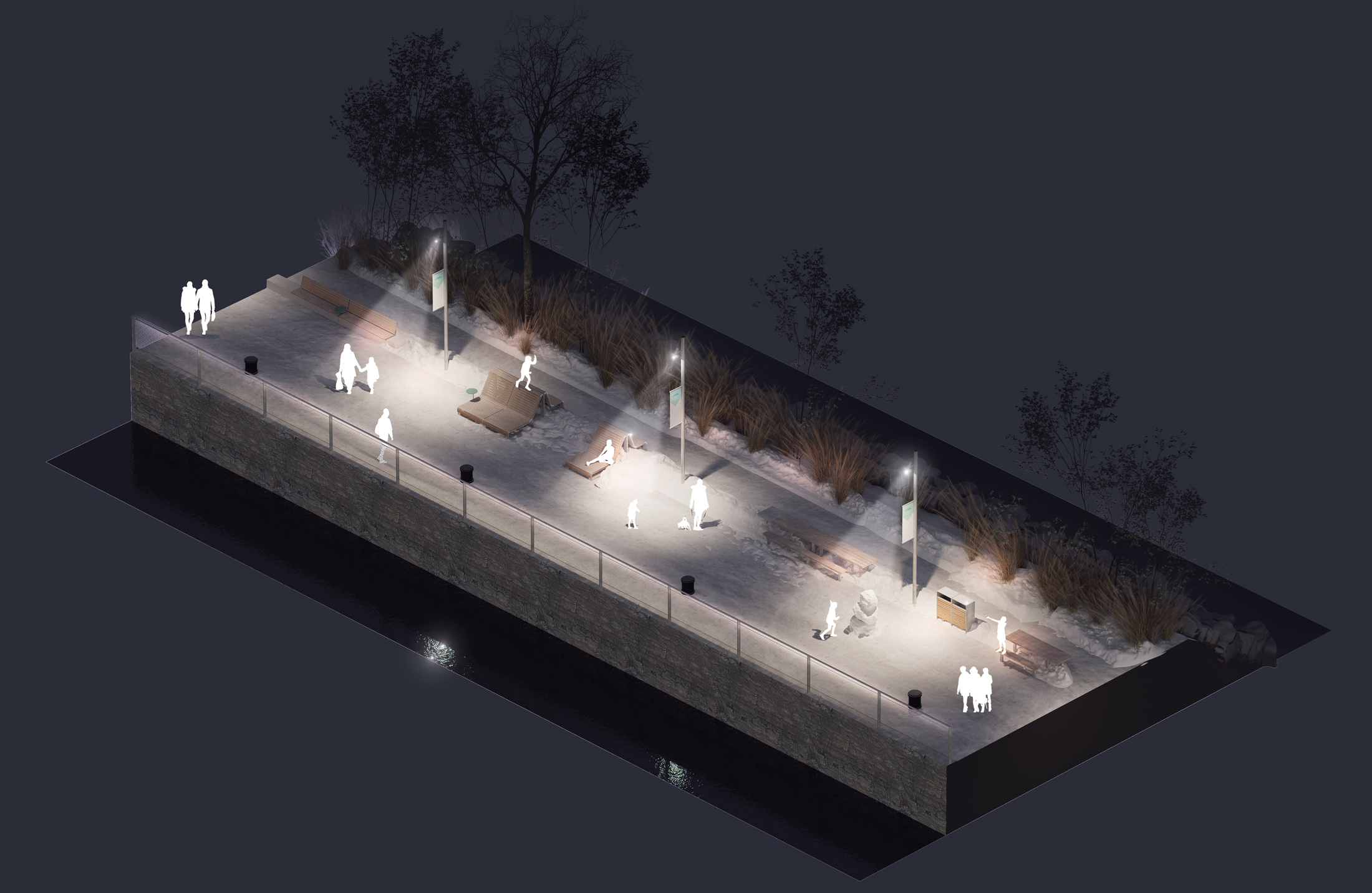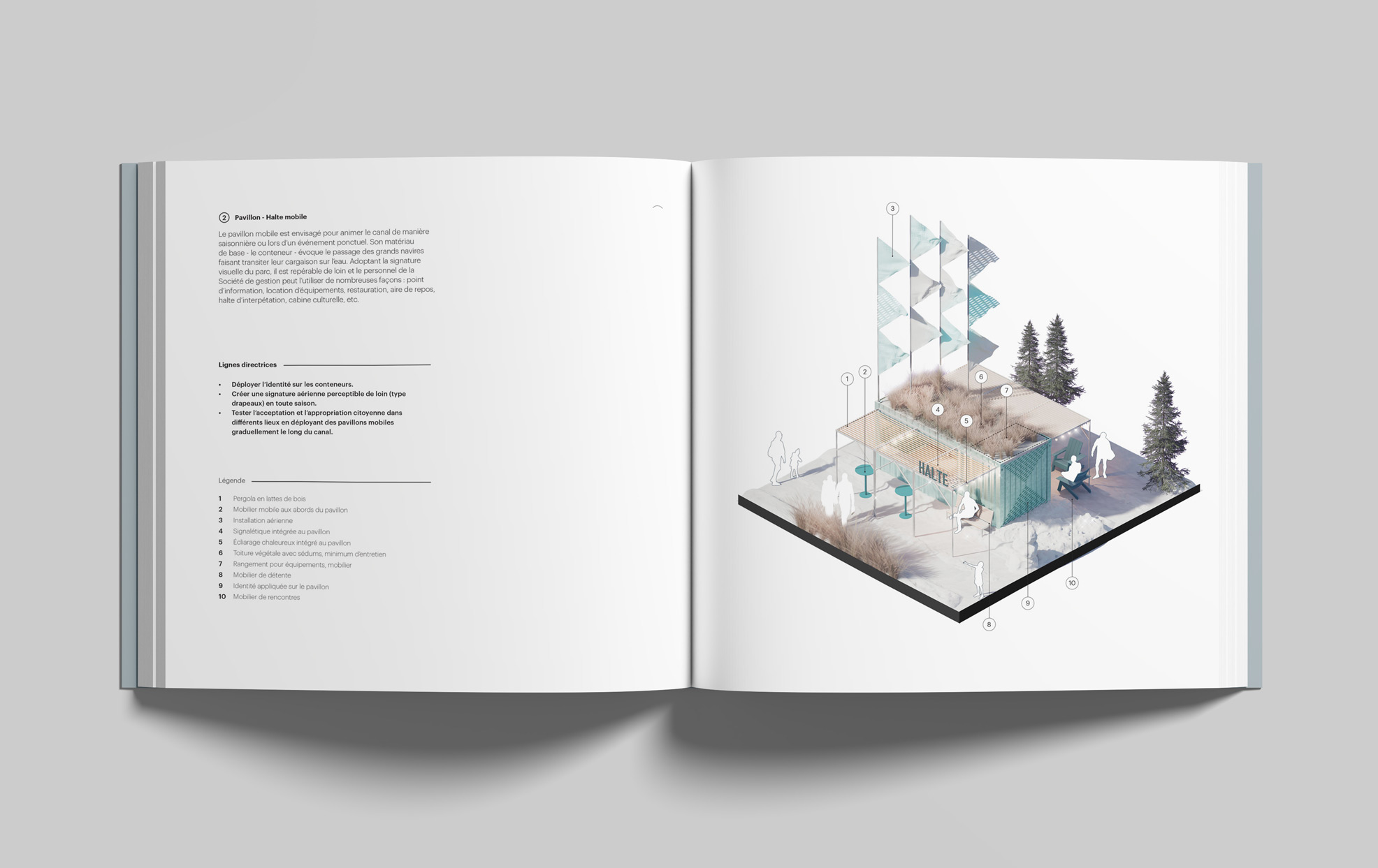 L’accessibilité et l’identité visuelle sont au centre de la démarche. Le plan directeur imagine un canal lisible et accueillant, dont la signalétique, le mobilier et les matériaux participent à la création d’une signature forte et cohérente. Bois clair, métal noir, pierre et accents de vert aqua évoquent à la fois le patrimoine nautique du lieu et une esthétique contemporaine. Des portes d’entrée claires, des pavillons d’accueil et des pôles d’animation facilitent l’orientation tout en créant des lieux de rencontre. Le canal devient un espace fluide, accessible aux piétons, cyclistes et plaisanciers, où le design soutient le confort et la convivialité.