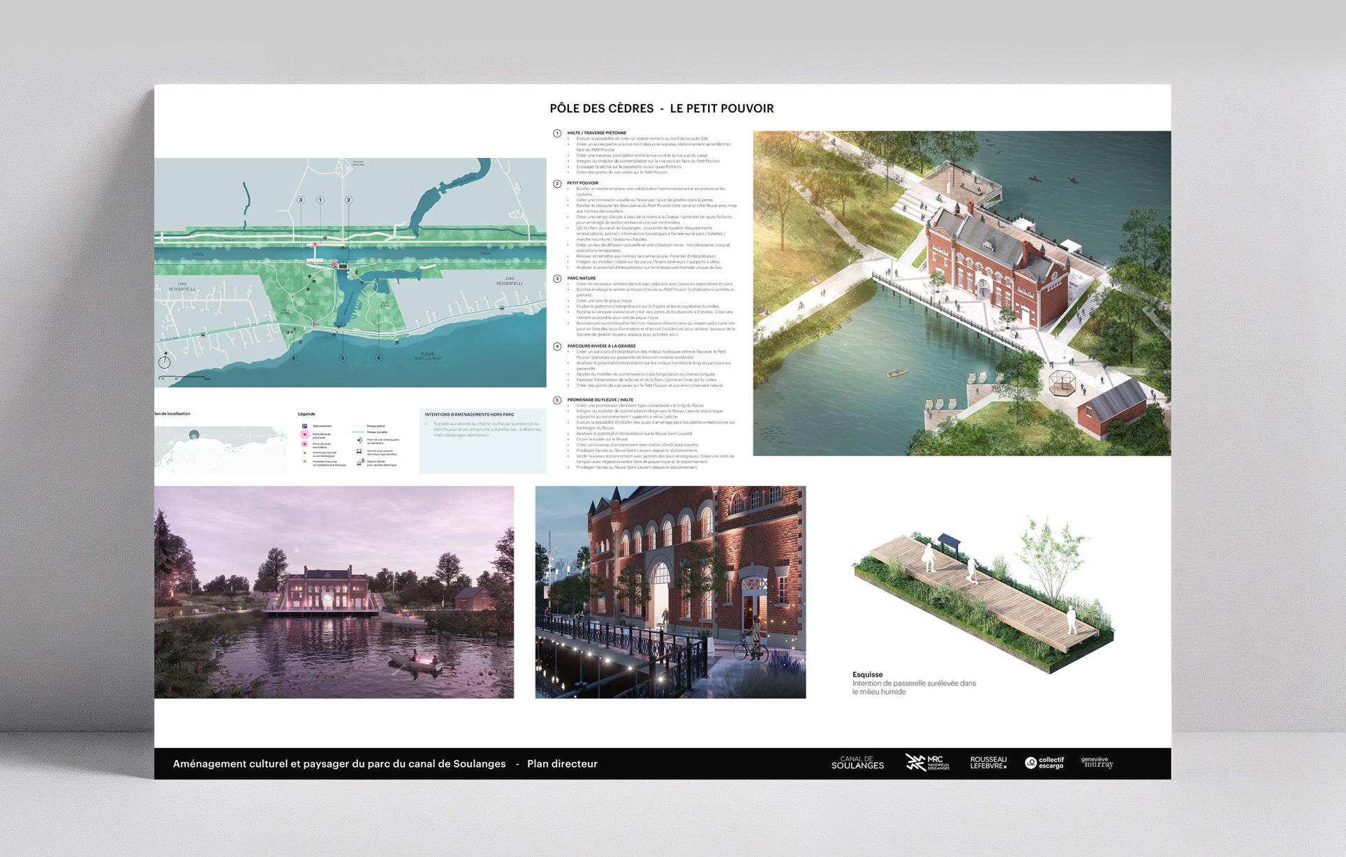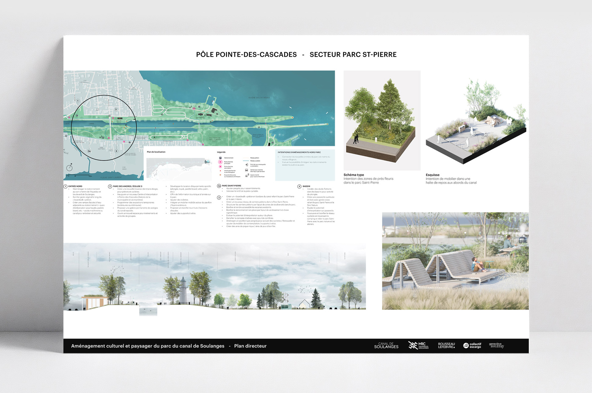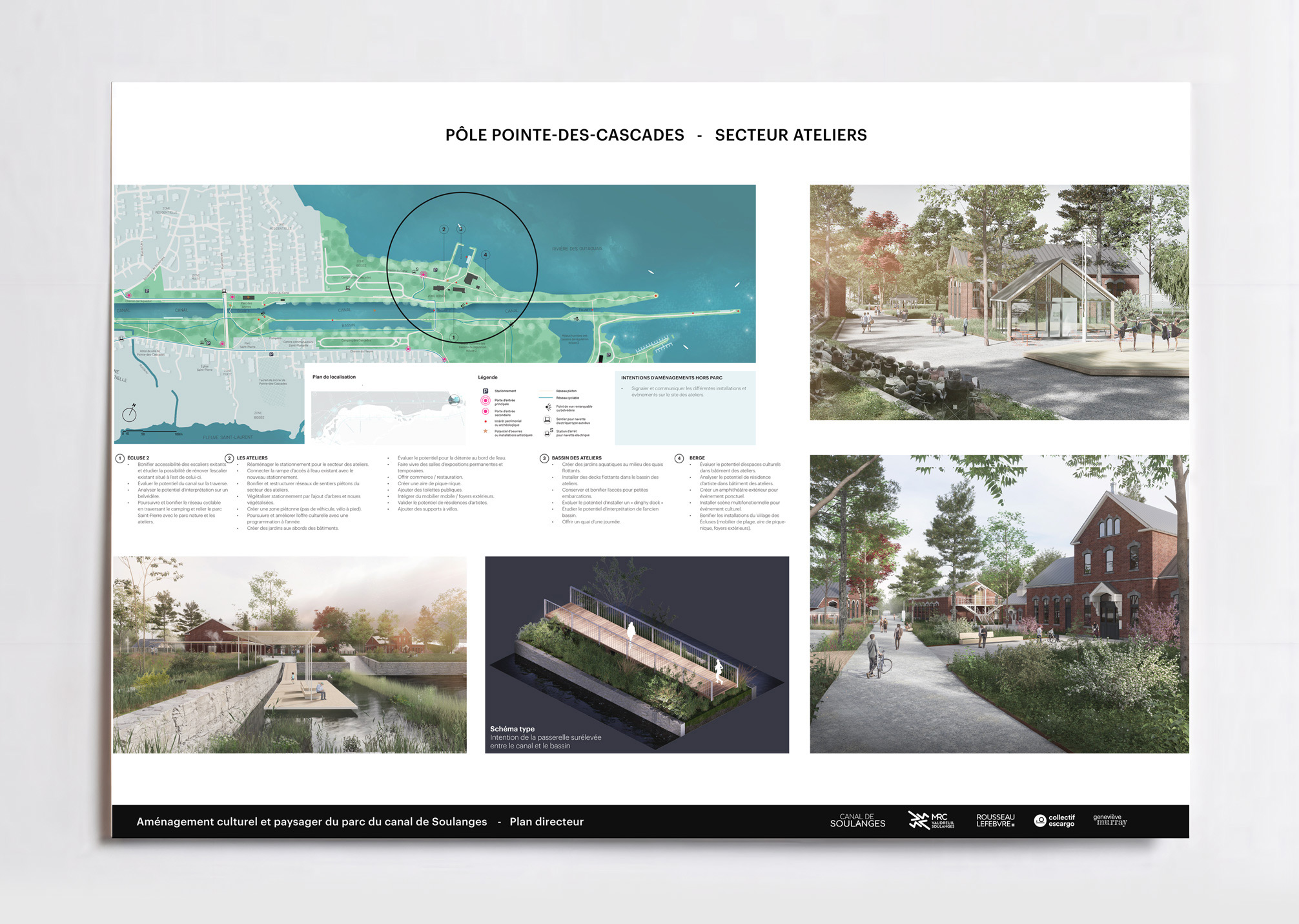Enfin, le plan directeur affirme le rôle structurant du canal à l’échelle régionale. Intégré au tissu urbain et aux réseaux cyclables et touristiques de Vaudreuil-Soulanges, il devient un axe de rayonnement et d’identité territoriale. Loin d’être un simple espace de passage, le canal de Soulanges est repensé comme un lieu de rassemblement et d’inspiration, un paysage habité qui relie les communautés par la culture, la nature et le design. Le projet incarne une vision d’avenir où la mémoire du territoire se conjugue au présent pour offrir aux générations futures un patrimoine vivant et partagé.