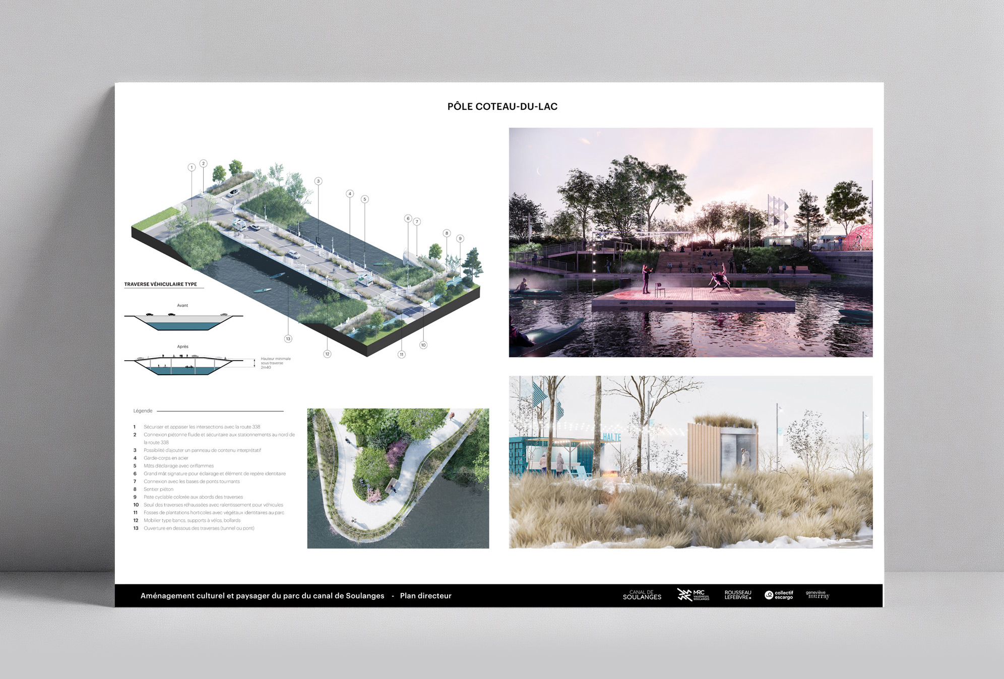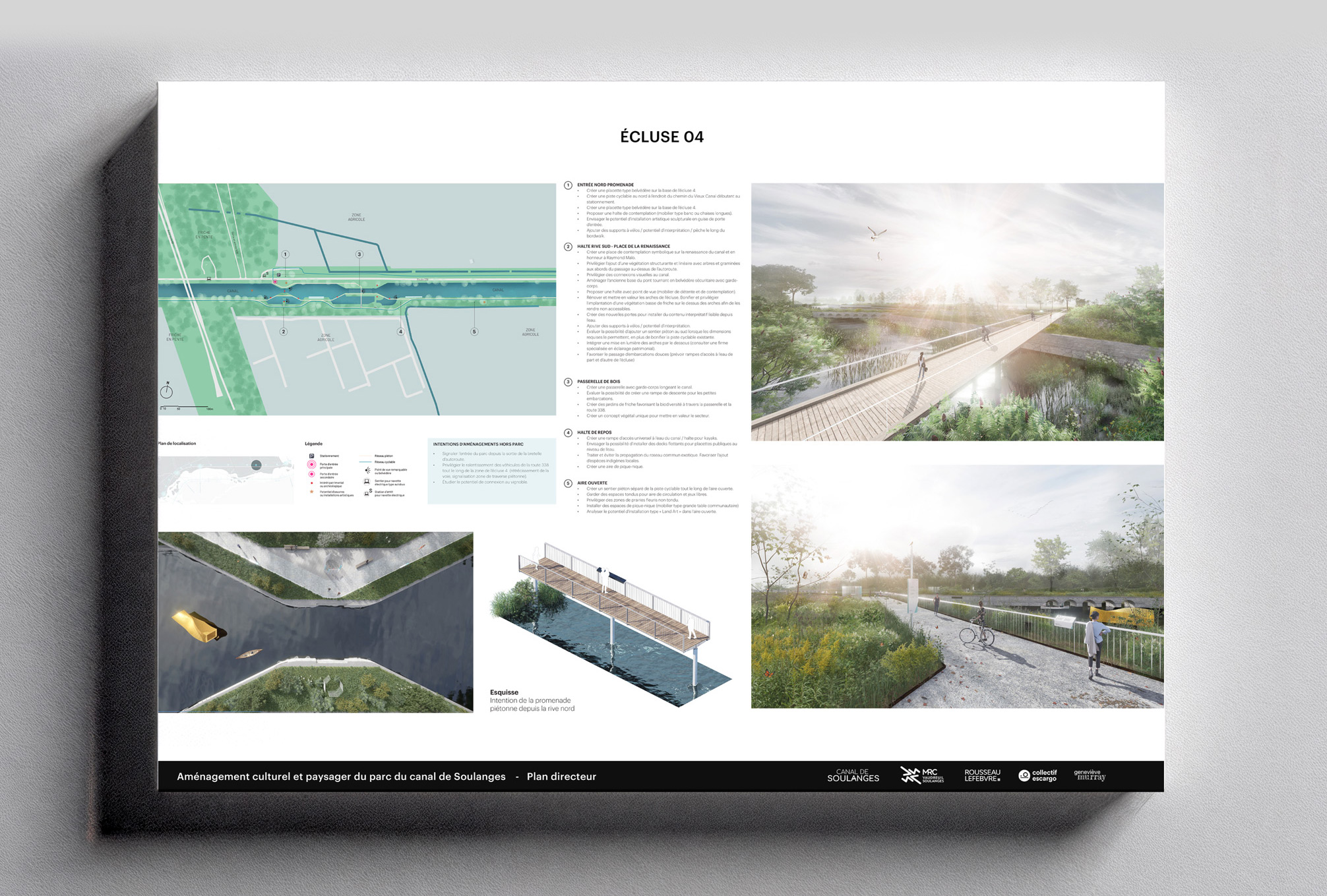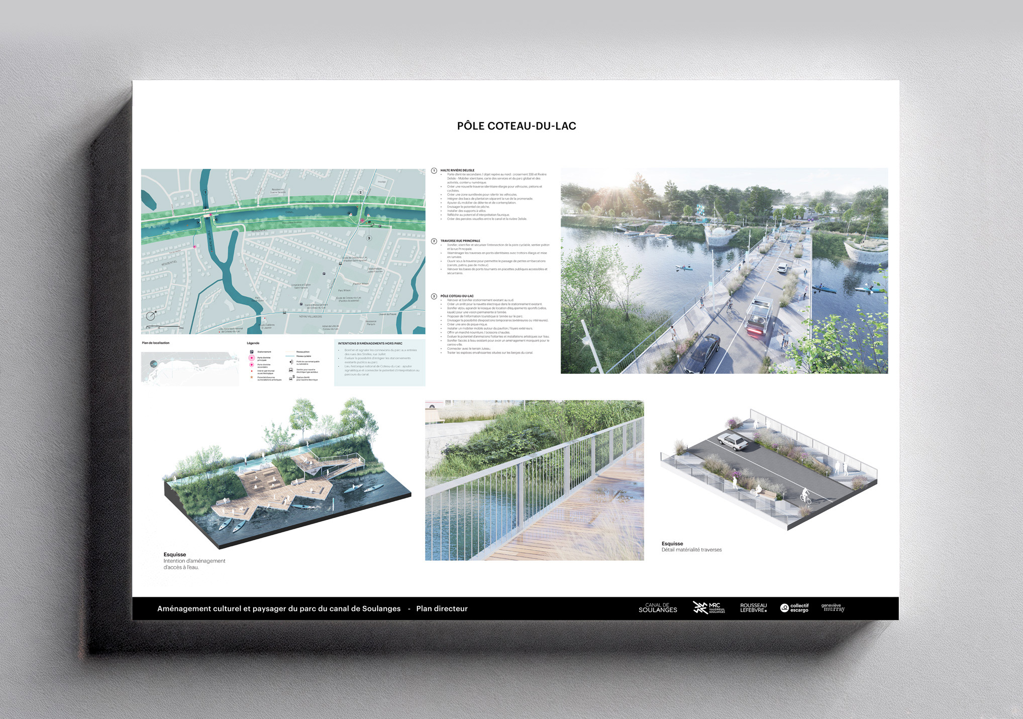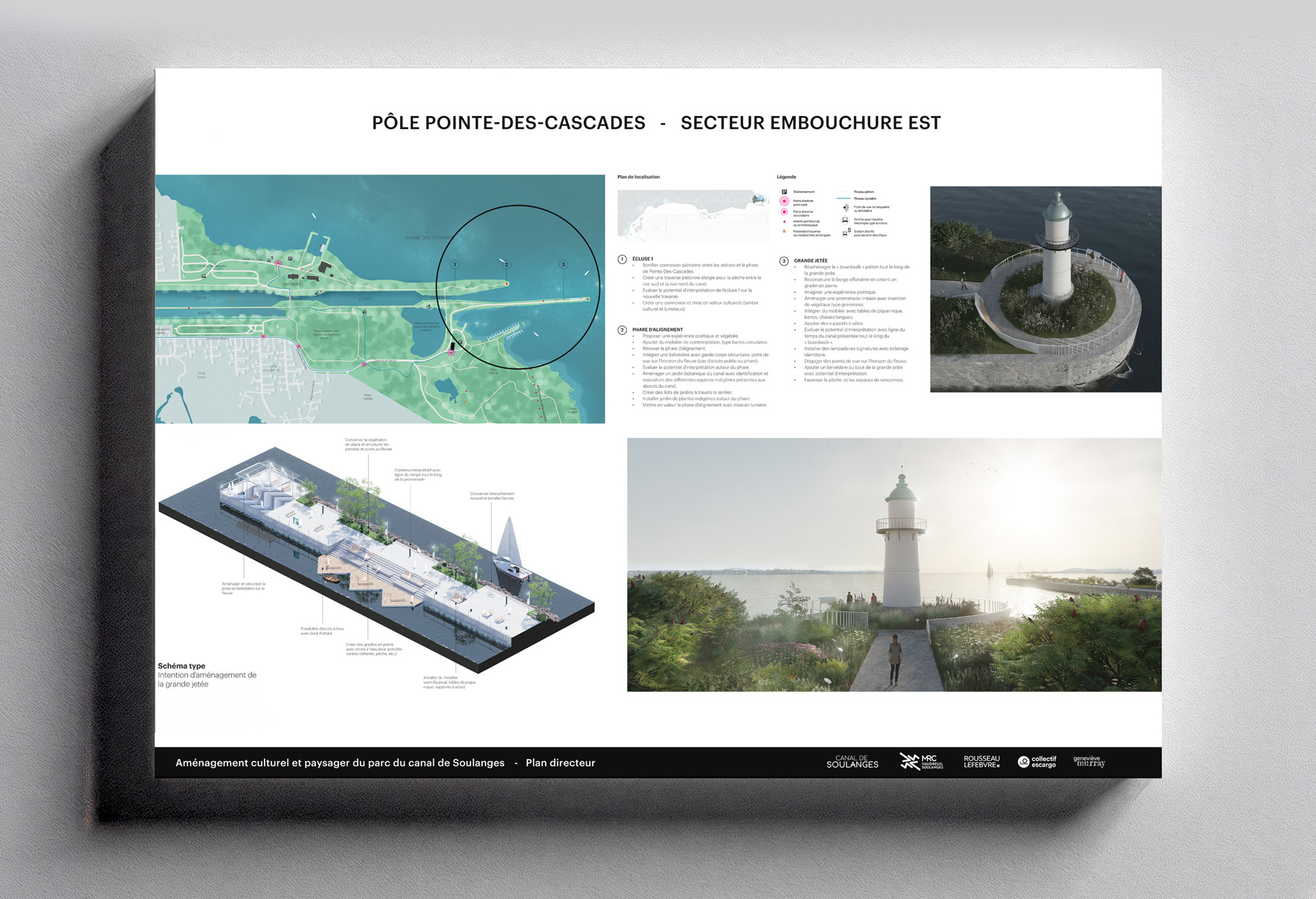 Enfin, le plan directeur affirme le rôle structurant du canal à l’échelle régionale. Intégré au tissu urbain et aux réseaux cyclables et touristiques de Vaudreuil-Soulanges, il devient un axe de rayonnement et d’identité territoriale. Loin d’être un simple espace de passage, le canal de Soulanges est repensé comme un lieu de rassemblement et d’inspiration, un paysage habité qui relie les communautés par la culture, la nature et le design. Le projet incarne une vision d’avenir où la mémoire du territoire se conjugue au présent pour offrir aux générations futures un patrimoine vivant et partagé.