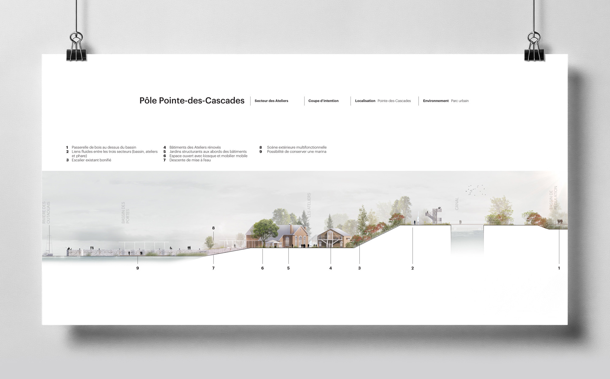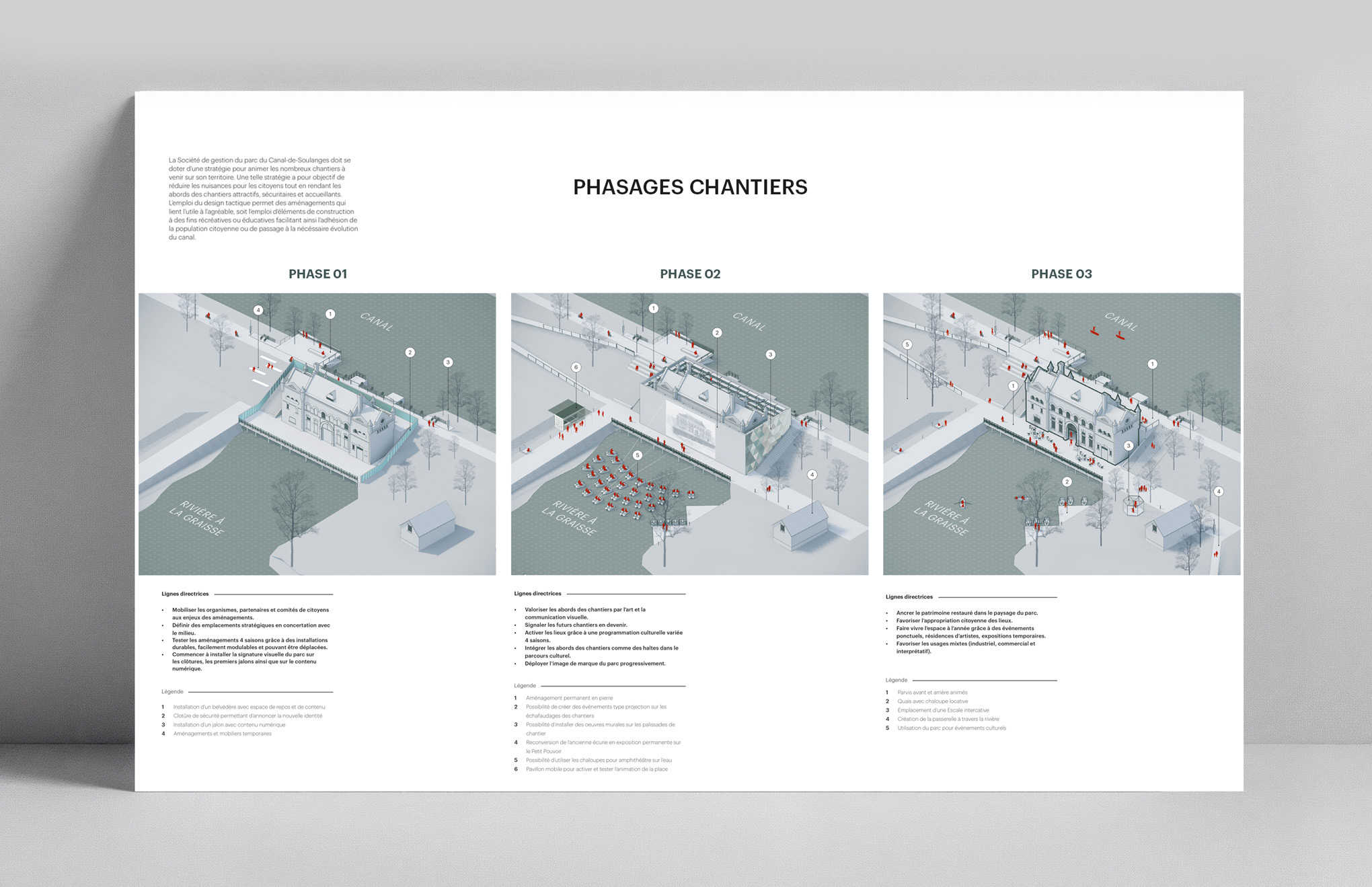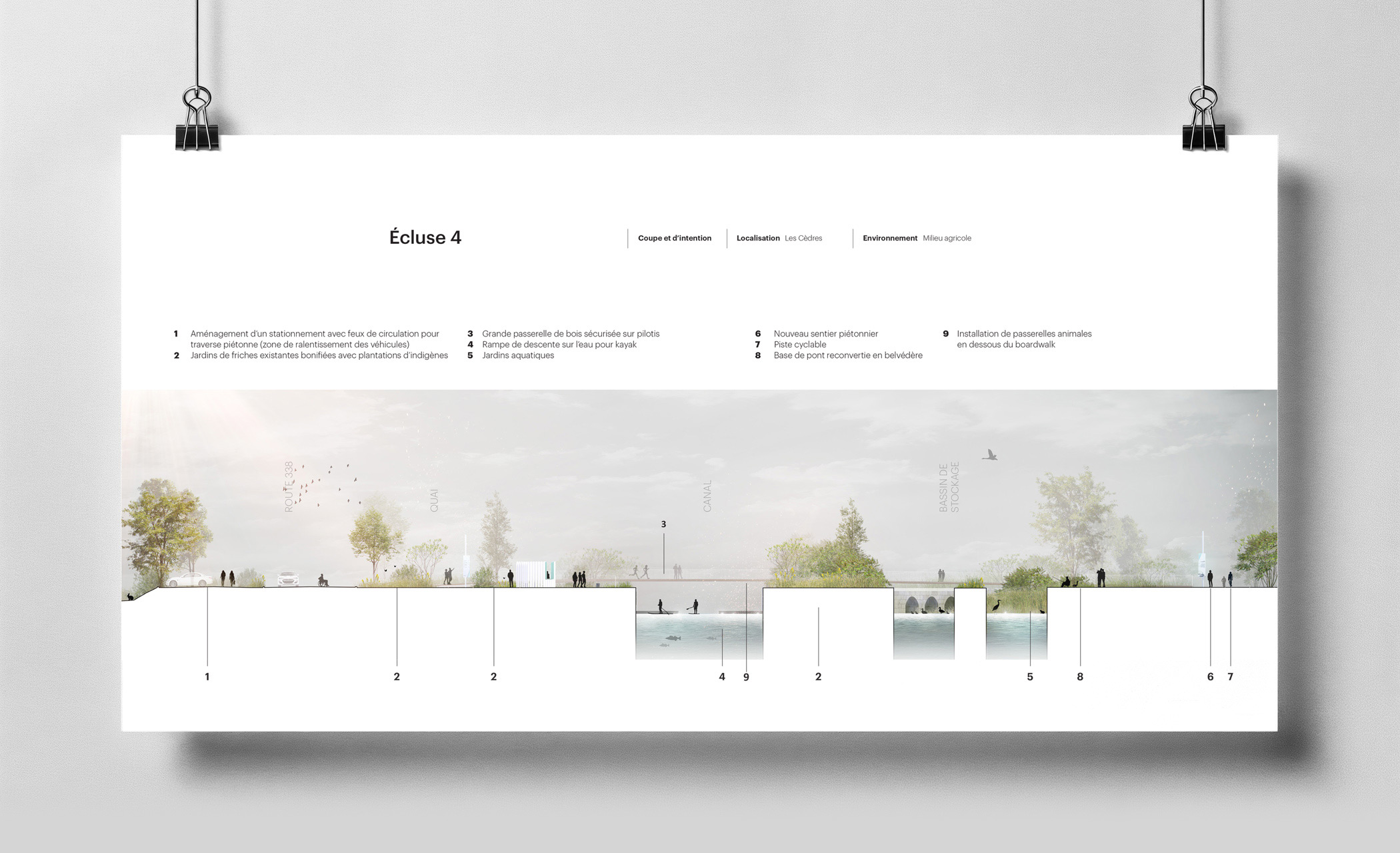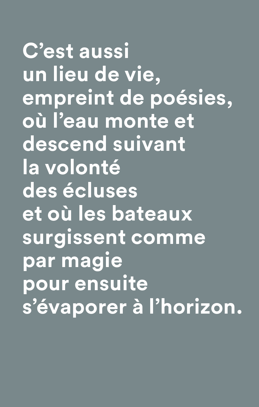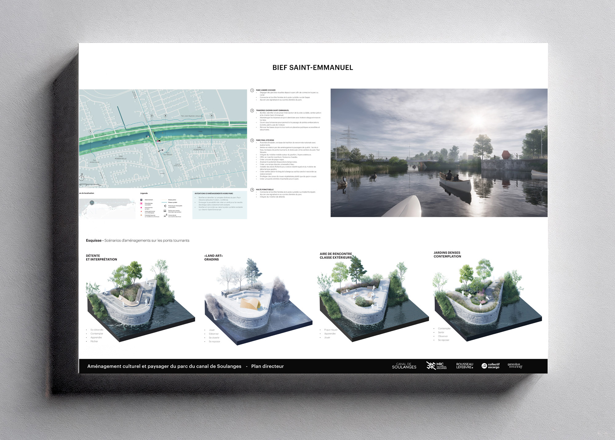 Lauréat d’un concours en architecture de paysage, le projet a été mené en collaboration avec Rousseau Lefebvre et la muséologue Geneviève Murray. Au cœur du concept, le thème du voyage guide l’expérience. Sous le titre évocateur Passagers, le projet invite à parcourir le canal comme on entreprend une traversée. Chaque escale devient un moment de découverte et de ressourcement. Le parcours est ponctué de haltes culturelles, de points de vue, de lieux d’interprétation et d’installations artistiques qui transforment la promenade en expérience sensorielle et narrative. Le visiteur chemine entre les traces du passé industriel et les paysages naturels, découvrant un territoire habité d’histoires et de poésie.