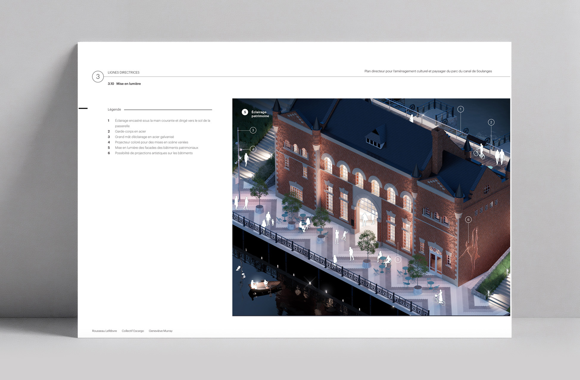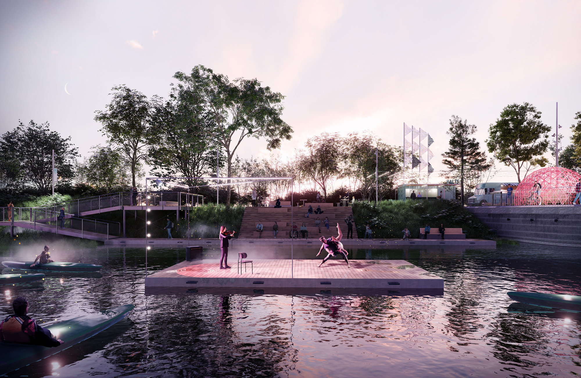 La dimension culturelle et patrimoniale occupe une place centrale dans le projet. L’aménagement met en valeur les structures existantes — écluses, phares, ponts tournants, bâtiments historiques — en les réinvestissant comme supports d’interprétation, de création et d’événements. La culture est envisagée comme un moteur de vitalité : expositions, festivals, installations artistiques et scénographies lumineuses ponctuent les saisons et font du canal un lieu d’expression et de célébration collective. Cette approche renforce l’identité du site tout en favorisant l’appropriation citoyenne et la participation des artistes et organismes locaux.