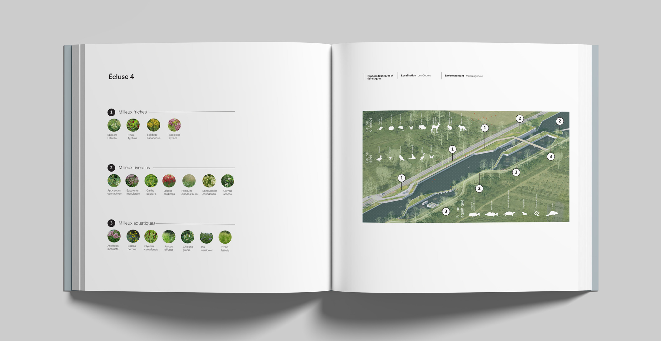Sur le plan écologique, le canal devient un corridor vert exemplaire. Le plan propose de restaurer et de protéger les écosystèmes riverains, de multiplier les zones de végétalisation et de renforcer les liens écologiques entre les boisés et les milieux humides. Les aménagements favorisent la cohabitation harmonieuse entre la fréquentation humaine et la biodiversité. Jardins de pluie, plantations indigènes et gestion écologique des eaux participent à la résilience du milieu et à la beauté changeante du paysage. Ce travail de naturalisation s’accompagne d’une réflexion sur la matérialité et la durabilité, plaçant la conception dans une perspective de développement responsable.