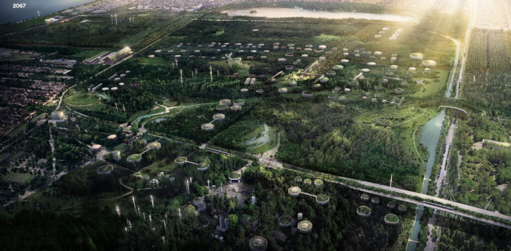 Les écosystèmes, le patrimoine industriel et paysager ainsi que la communauté sont unis à travers de nouveaux espaces de vie. L’architecture est repensée pour son efficacité énergétique et pour l’autosuffisance alimentaire. Les circulations forment une nouvelle trame urbaine connectée et vivante, testée et construite en collectivité.