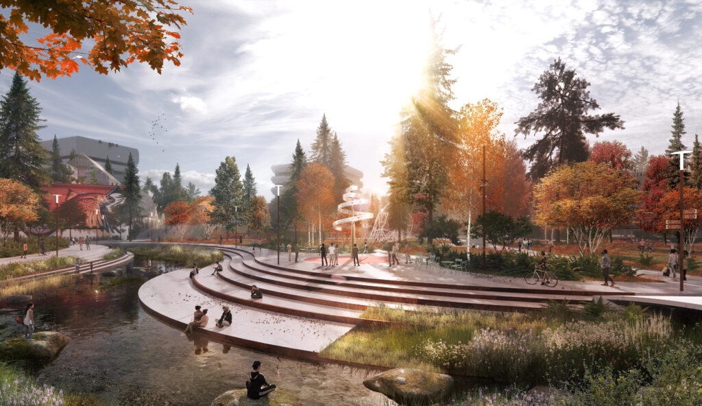 Révéler, Régénérer et Unir. Trois gestes pour faire du centre-ville de Sudbury un écosystème unique, vibrant et évolutif. La beauté du paysage est révélée par une biodiversité et une nordicité chaleureuse. Les anciens cours d’eau réapparaissent et sont rendus à la population. Le centre-ville est désenclavé et connecté au reste du grand Sudbury. La communauté est au cœur des transformations qui façonnent l’espace public et s’inscrit activement dans la vision et les changements. S’inscrivant dans la démarche du Living Future Challenge, le centre-ville de 2050 élève les standards en matière de développement durable, de conception et de construction de milieux de vie. Le coeur de Sudbury est un modèle de cette vision novatrice, tant à l’échelle de l’habitat, que du paysage et de la trame urbaine elle-même.