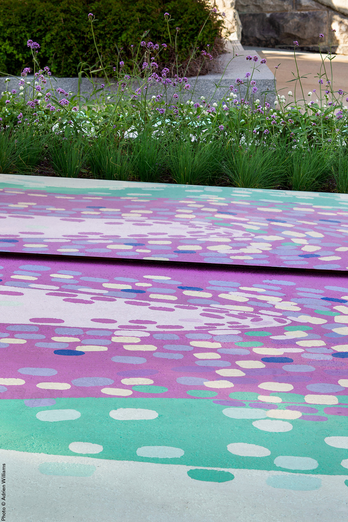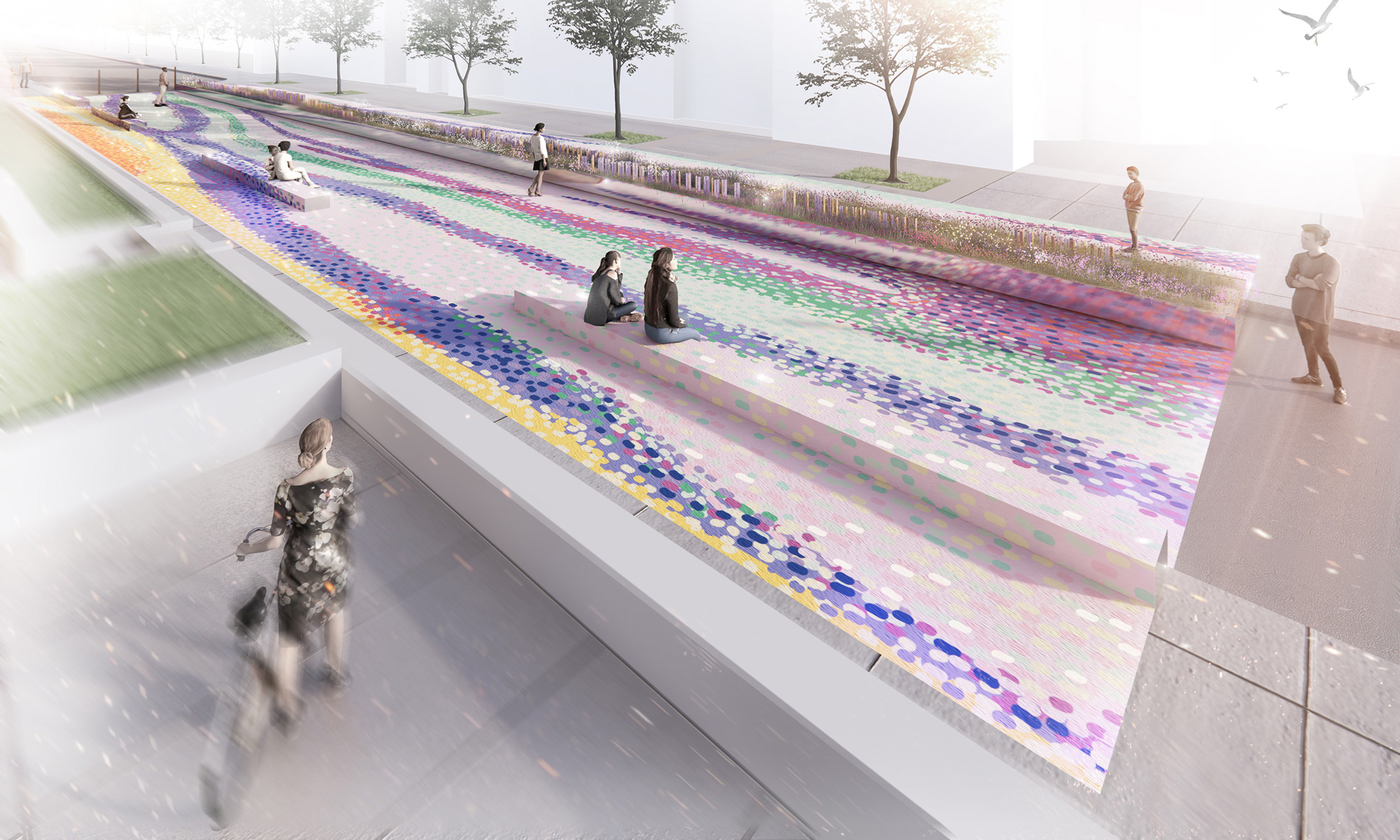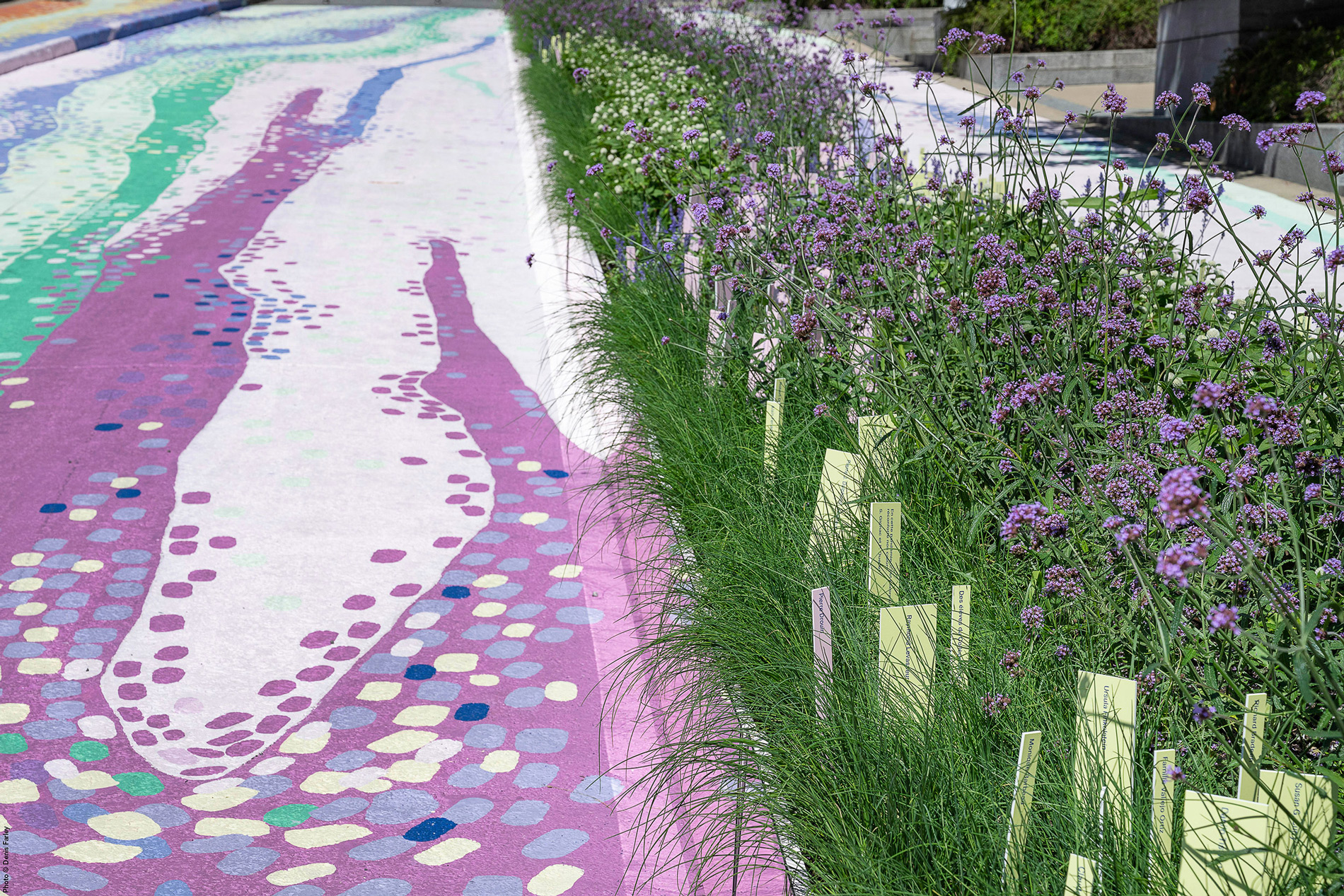 En se plongeant dans cet univers réfléchi et méthodique de coloris et de lumière, Voiliers s’inspire des reflets de l’océan très présents dans les toiles des peintres postimpressionistes. La place devient l’impression d’une surface miroitant des teintes vives et pastels. L’image reprend la technique de superposition des couleurs afin de créer des motifs de reflets en mouvement. Un grand jardin linéaire fait écho aux mouvements des vagues. Les végétaux choisis pour leurs boutons colorés apportent une dimension scintillante et dansante à l’installation.
