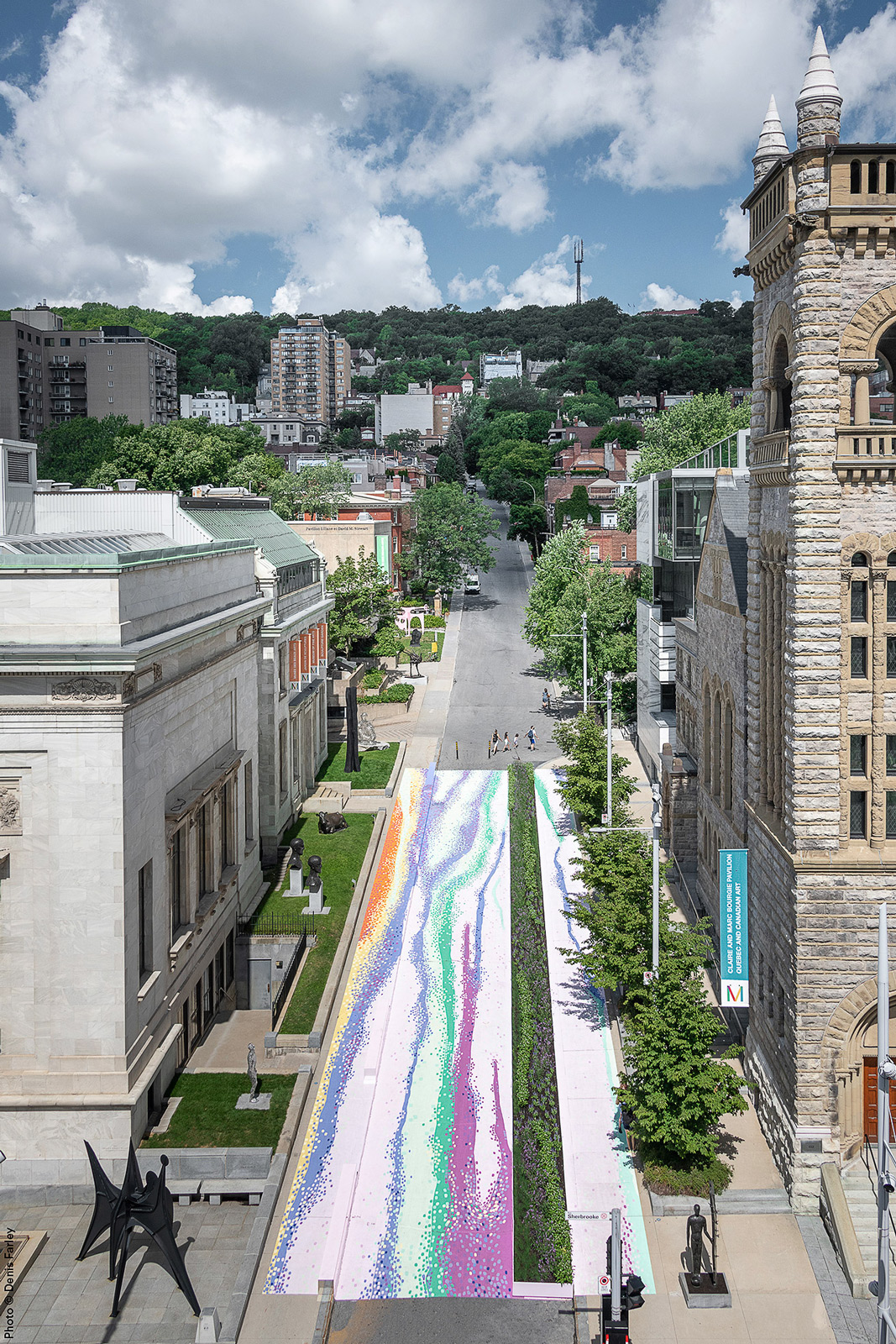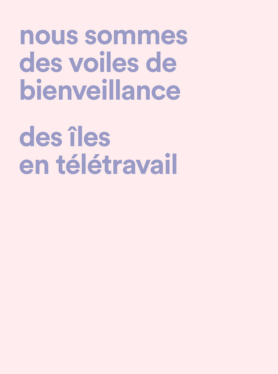 Nous sommes des Voiliers. Des bateaux contraints de voguer à distance l’un de l’autre. Errant sur un océan à l’allure d’un écran pixellisé, nous sommes des îles en télétravail, des voiles de bienveillance en quête d’horizon. Dans un monde fuyant les collisions, la place vibre de positivisme ou dialogue, avec harmonie et unité, la joie des couleurs.